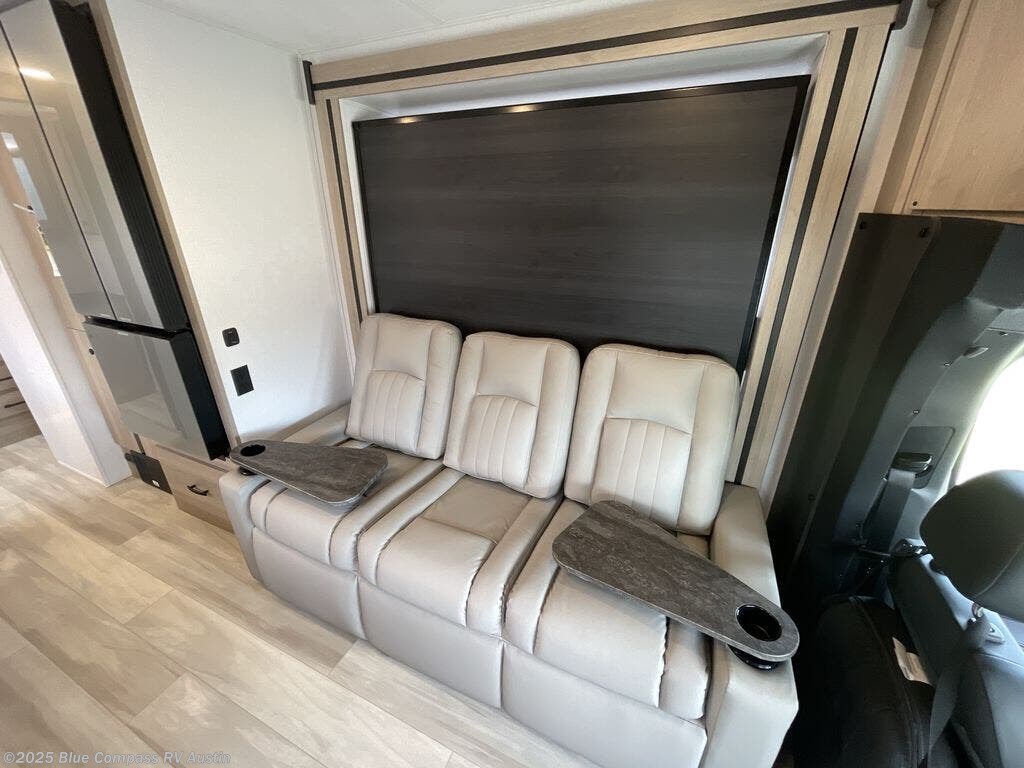 Trips across the state are made cozy in this single slide out coach for two! Once you've parked for the day, you can make lunch on the recessed induction cooktop or in the convection microwave. The sofa slide out provides a place to relax, and the Murphy bed can be folded out when you're ready for some shut-eye. You will appreciate how spacious the full rear bath is, and there is a wardrobe plus a linen closet here for ample storage. The cab-over bunk is only available with the Trekker Cap option; see dealer for more details.