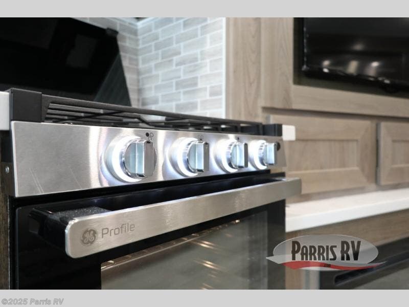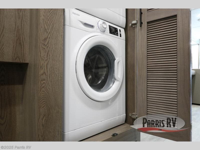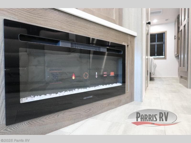It won't be hard to find comfort in this spacious coach for five to six! Once you arrive at the campground, you can put out the 19' power awning with an LED light and turn on the outdoor TV. Once you've unloaded the pass-through storage, you can head inside to relax on the 68" theater seating or play a game at the wrap-around booth dinette. There is also a 40" Smart TV with a hidden pantry behind it and a fireplace for those cooler evenings. The chef will find everything they need to prepare meals each day, including a residential microwave, a stainless steel three burner cooktop with a 22" oven, and a stainless steel 15 cu. ft. 12V refrigerator for food storage. You can retreat to the rear private bedroom when you're ready to call it a night. Here, you'll enjoy a king bed slide out with dual nightstands and 110V/USB ports, dual bedroom wardrobes, and a 32" 12V TV. This model also includes a convenient full bath and a stackable washer and dryer prep if you choose to add those appliances!