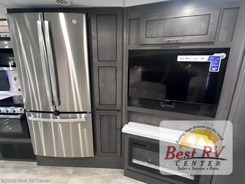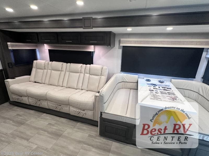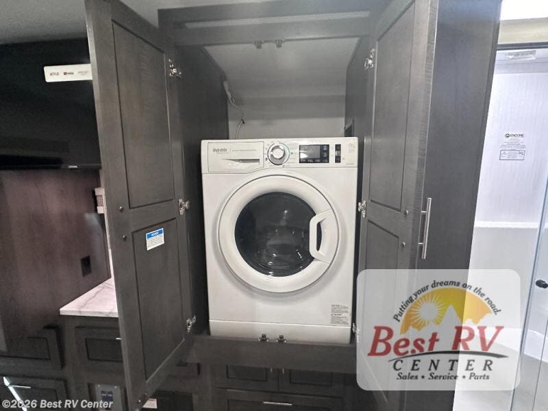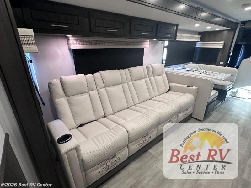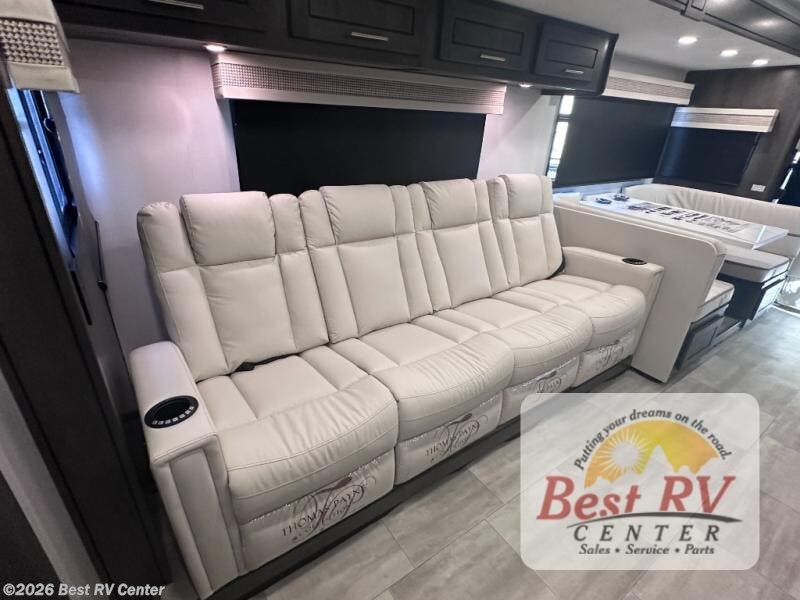 You will love the spacious living entertainment in this motorhome! There is a Thomas Payne 4-person theater seating that reclines with adjustable headrests, heat, massage and has pop-up 110V outlets. There is also a 5,000 BTU fireplace with a 40" LED TV to watch your favorite movies in true comfort. The kitchen has everything you need to prepare your best home cooked meals including a brush nickel designer faucet with a pull out spray wand for easy clean up, and you can enjoy all of your meals at the Dream Dinette. You will appreciate having your own private retreat with the rear bedroom which has a 72" x 80" king bed slide across from a dresser with a 32" LED TV, a wardrobe on one side, and another wardrobe on the other with an optional combo washer and dryer. There is also a power front overhead bunk for more sleeping space!