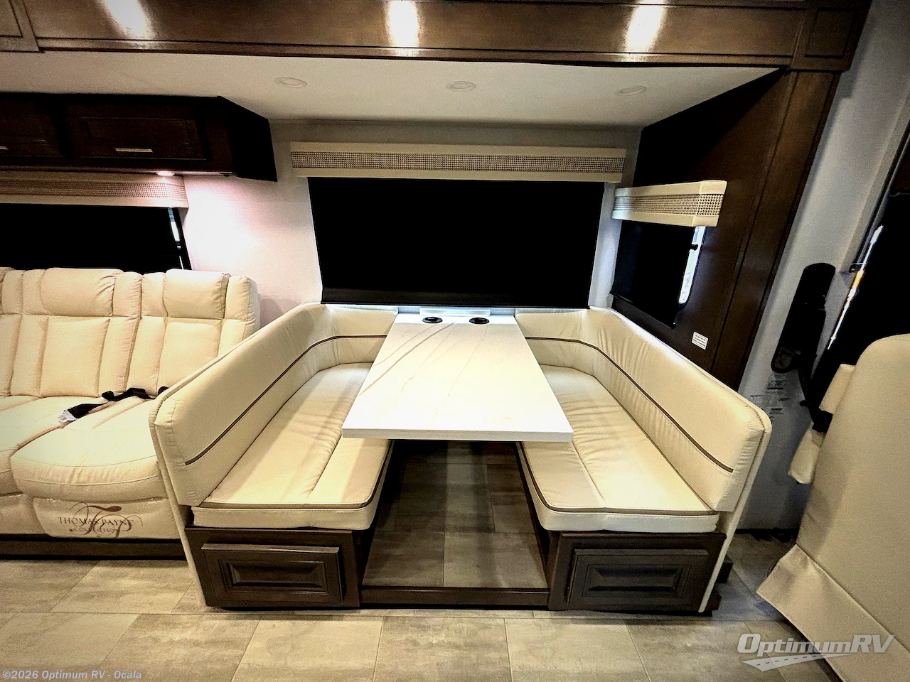 You will love the spacious living entertainment in this motorhome! There is a Thomas Payne 4-person theater seating that reclines with adjustable headrests, heat, massage and has pop-up 110V outlets. There is also a 5,000 BTU fireplace with a 40" LED TV to watch your favorite movies in true comfort. The kitchen has everything you need to prepare your best home cooked meals including a brush nickel designer faucet with a pull out spray wand for easy clean up, and you can enjoy all of your meals at the Dream Dinette. You will appreciate having your own private retreat with the rear bedroom which has a 72" x 80" king bed slide across from a dresser with a 32" LED TV, a wardrobe on one side, and another wardrobe on the other with an optional combo washer and dryer. There is also a power front overhead bunk for more sleeping space!