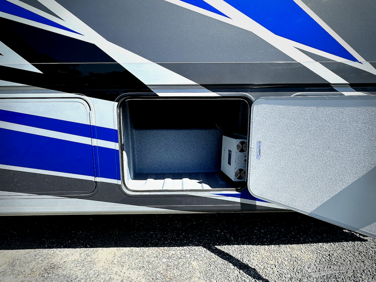 Three slides help to open up this motorhome! The kitchen slide features all of your essentials for cooking delicious meals and you even have a hutch with overhead cabinets to store all of your dishes. The Dream Dinette and Thomas Payne theater seating slide not only open up the living area, but also provide comfortable places to eat meals and unwind in front of the 5,000 BTU fireplace and 40" LED TV after a long day of traveling. The half bathroom is close to the kitchen and living area so you don't have to go far for a quick bathroom break. The master suite will have you feeling right at home with a 72" x 80" king bed slide to lay your head on at night with a dresser across from it that also has a 32" LED TV and wardrobes on either side of it with one of them with an optional washer and dryer. Plus, you even have access to the full rear bathroom which has a shower with a seat to freshen up in each morning!