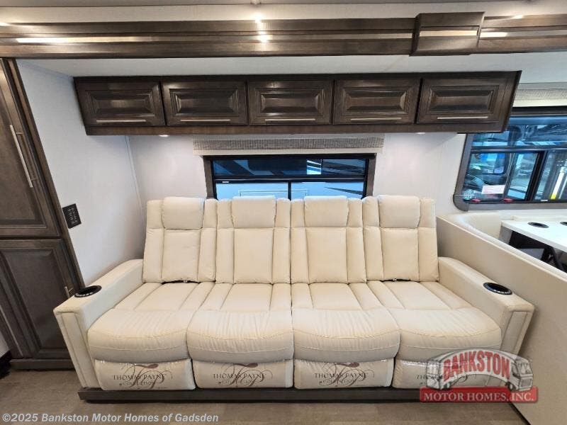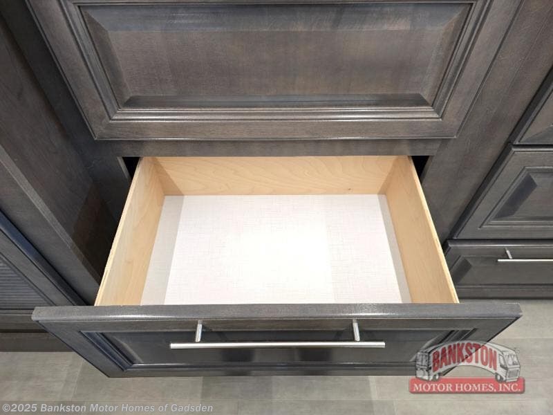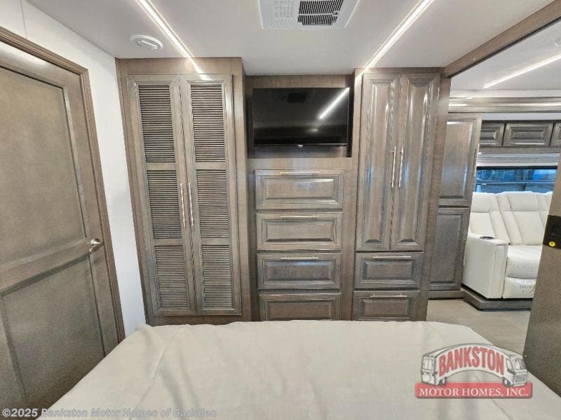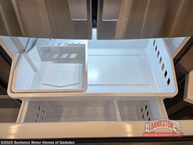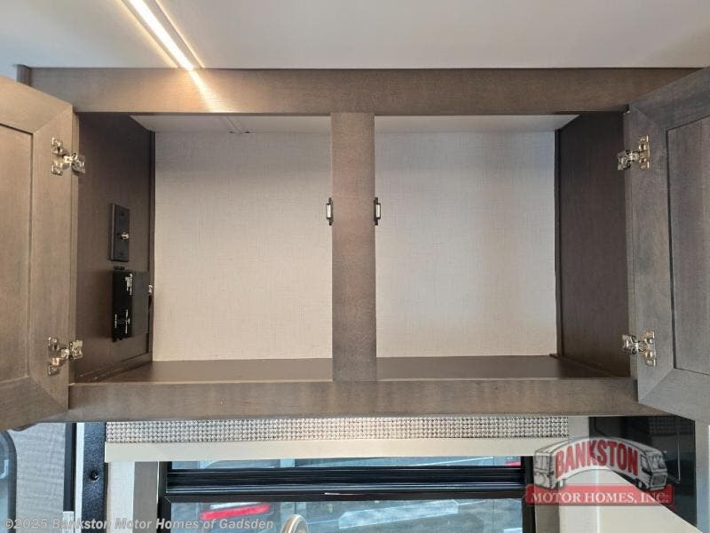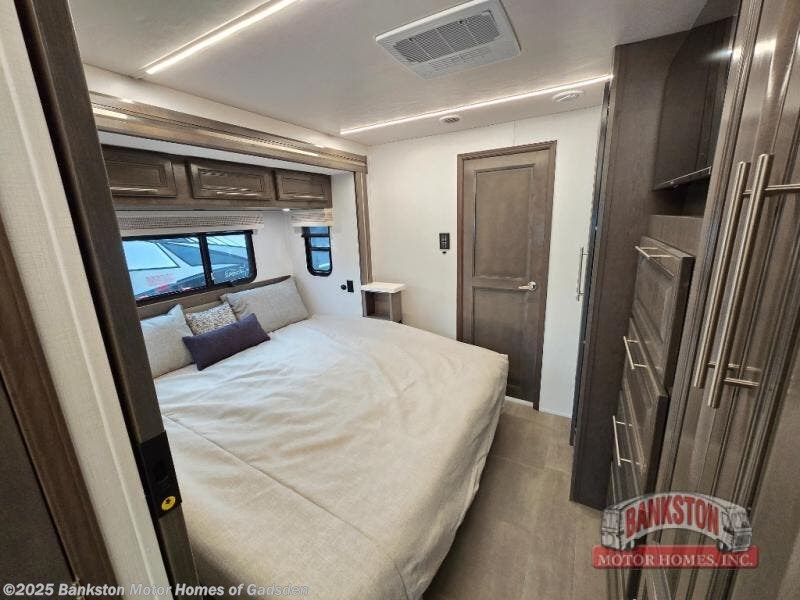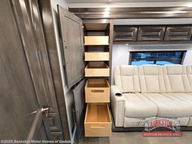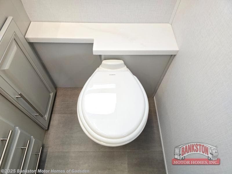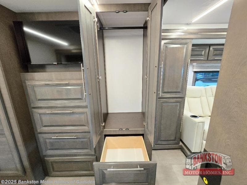 Comfort and convenience is found all throughout this motorhome! Starting with the full rear master bath that has a shower with a seat and a dual sink vanity, plus it leads into the private bedroom. Inside the bedroom is a 72" x 80" Power Tilt king bed slide with overhead cabinets across from a dresser with overhead cabinets and a 32" LED TV, a wardrobe, and another wardrobe that is prepped to add an optional stackable washer and dryer. The half bathroom is conveniently near the fully equipped kitchen so you can get back to creating your best home cooked meals fast. Relax in true comfort each night by either playing games at the booth dinette or on the theater seating that comes with power recline, heat, and massage!