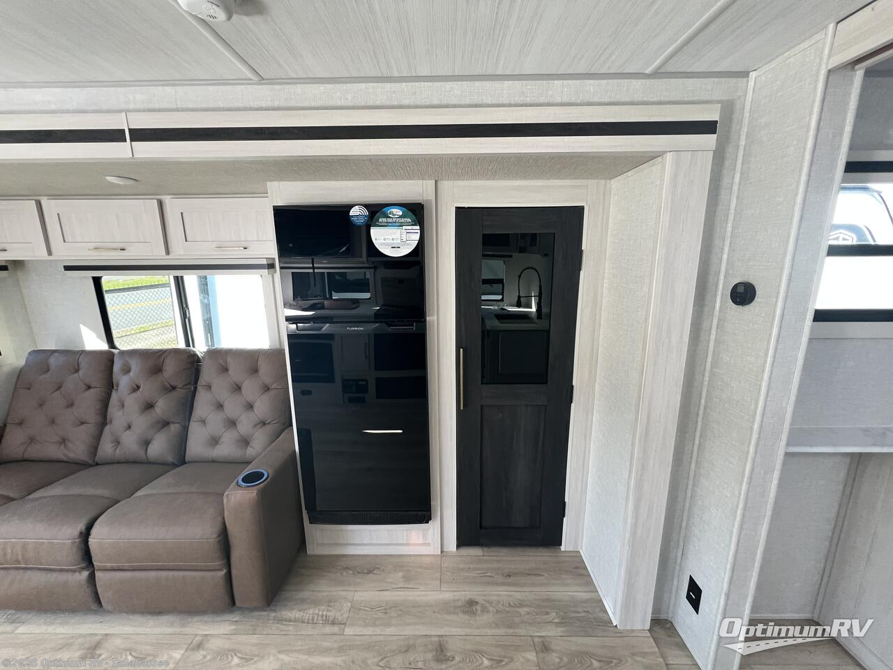 Camping your favorite site has never been more relaxing than in this travel trailer. You can comfortably sleep five to six each night with the custom king bed in the front master bedroom, plus the tri-fold sofa and booth dinette in the rear living area. There is also a walk-through bath that will easily accessible for everyone to use. Whip up your best meals on the residential range, or head outdoors to cook on the gas griddle included within the outdoor kitchen. You'll also find a sink and a refrigerator, and a 21' power awning with LED lights to create the perfect outdoor living space. After a day outdoors, you can relax by the fireplace or watch a movie on the HD TV, and there is a large kitchen pantry to stock up on snacks!