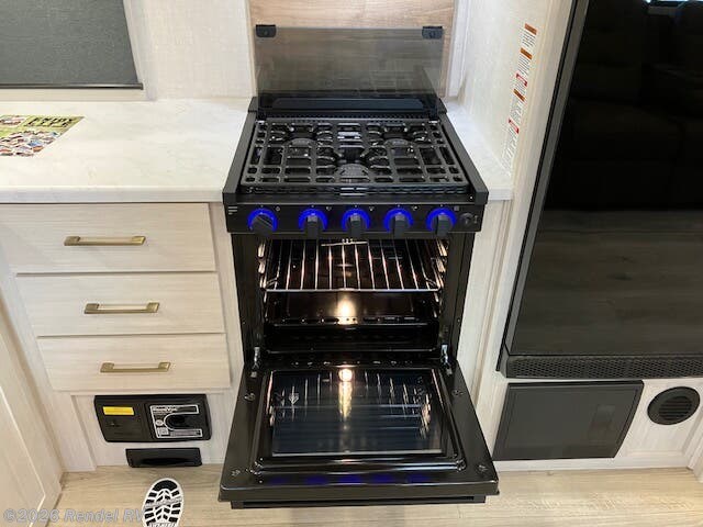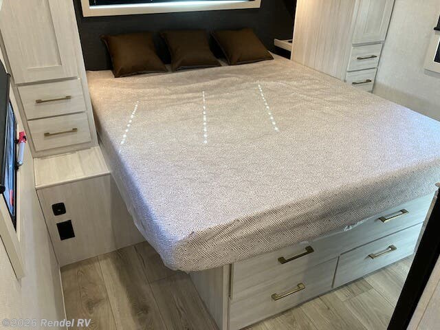 The Grand Surveyor also boasts an outside kitchen for your outdoor cooking adventures, complete with an exterior grill and speakers to enjoy your favorite music under the stars. The power awning extends your living space outdoors, giving you ample opportunities to create lasting memories.