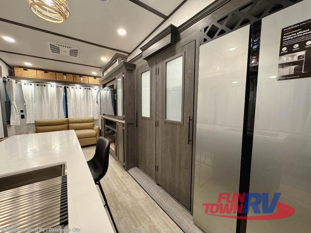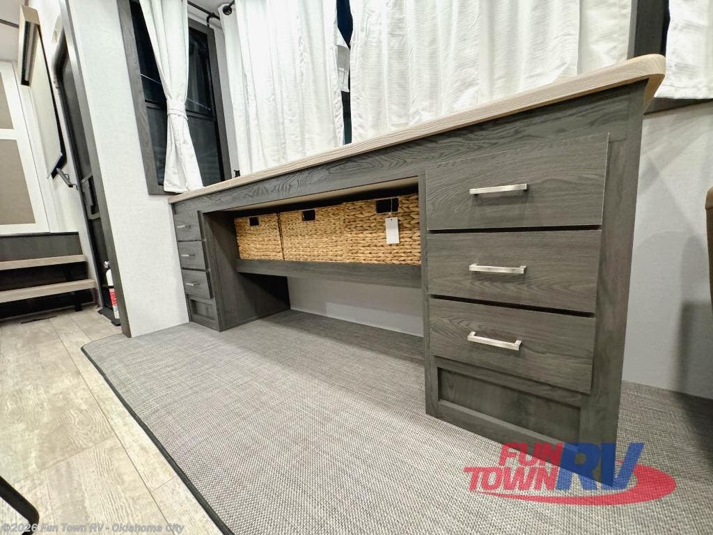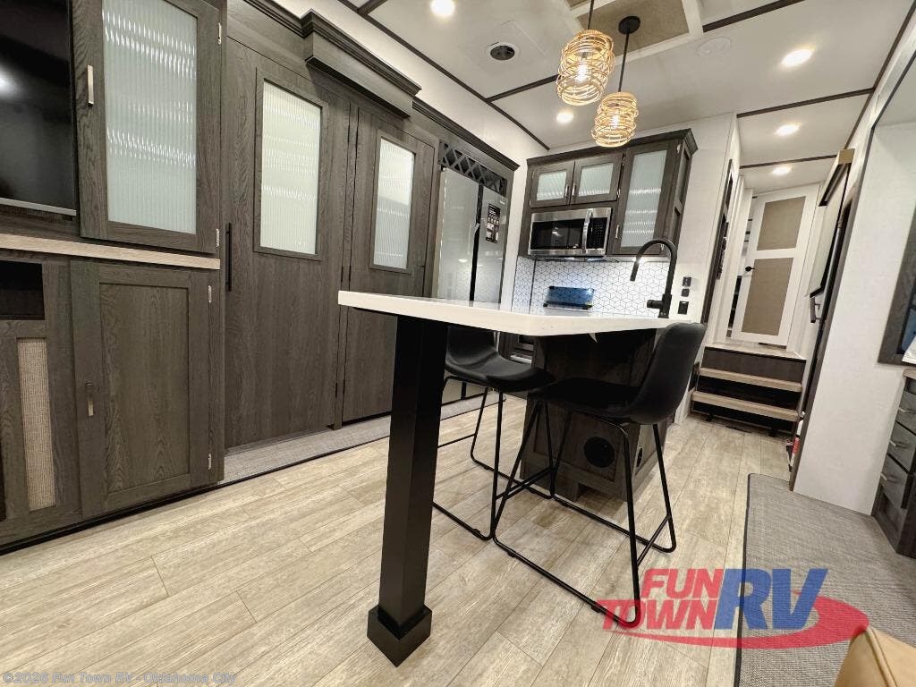 Step inside this luxurious fifth wheel that can sleep five each night! The rear tri-fold hide-a-bed sofa and theater seating provide a relaxing evening by the entertainment center with a 55" TV. Next to the entertainment center is a hidden door with cabinets and 16 cu. ft. 12V refrigerator, and a 36" x 74" flip-down bunk with storage. The kitchen has plenty of countertop space to prepare your best home cooked meals and an island with four bar stools to enjoy your meals. You also have a desk with storage to get some work done if needed. As you walk up the floating steps, you will notice the full bathroom to your left with a walk-in shower with a skylight for added natural lighting and a dual sink vanity for two to get ready at once. The front private bedroom has a king bed with Versa Tilt technology slide, a dresser next to a bench and a front wardrobe that is prepped for a washer and dryer!