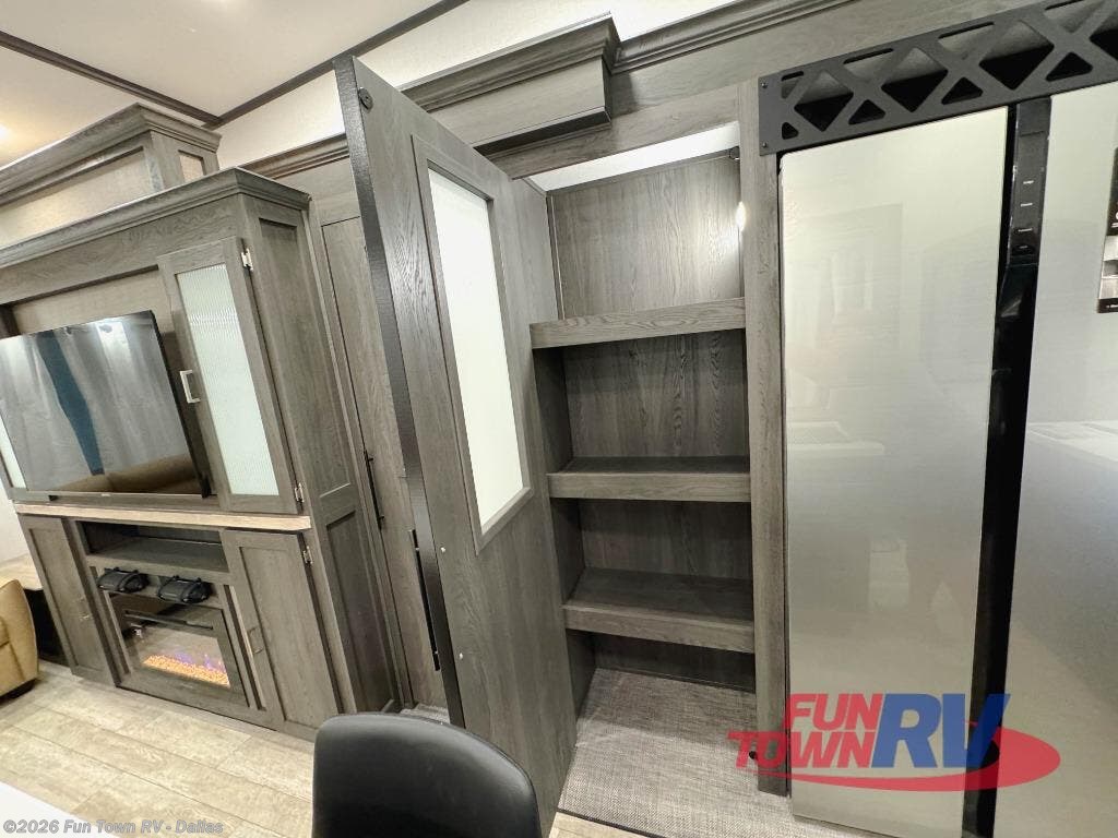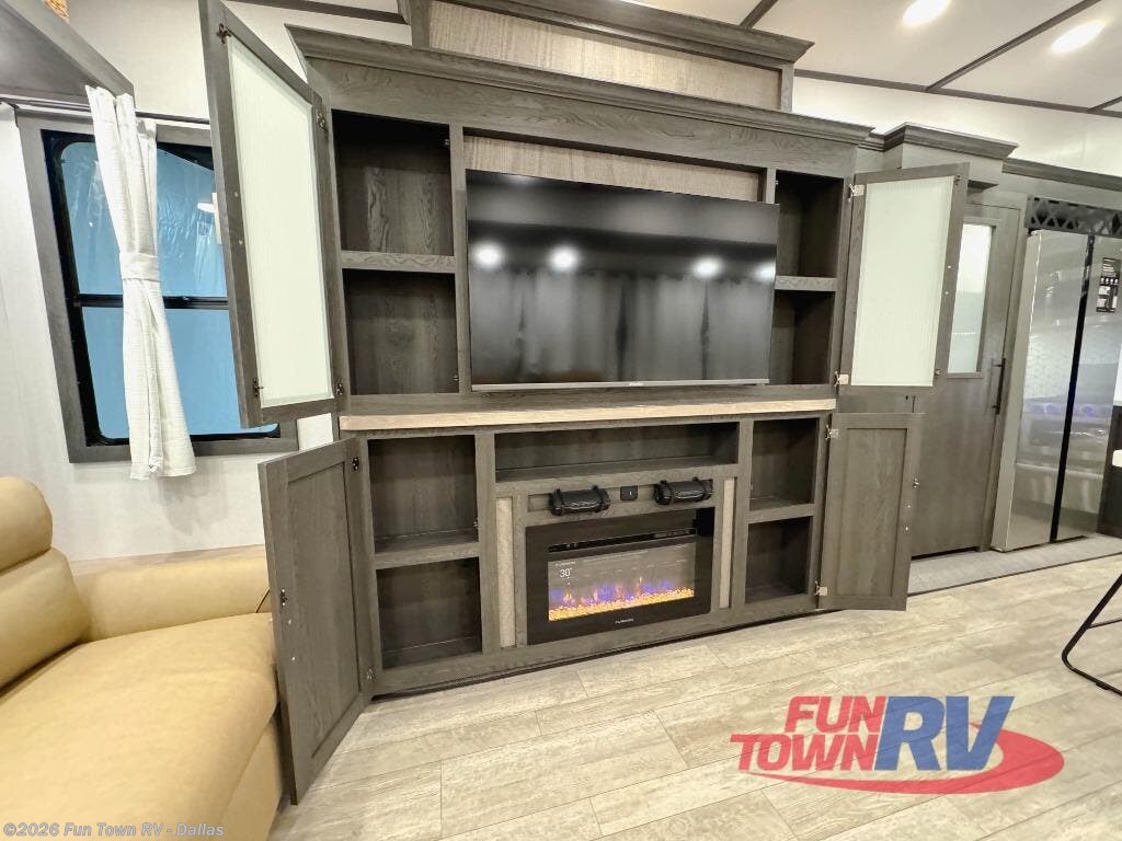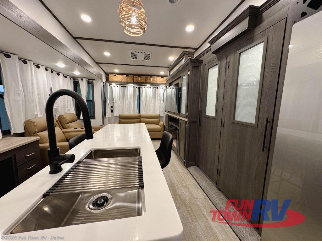 Step inside this luxurious fifth wheel that can sleep five each night! The rear tri-fold hide-a-bed sofa and theater seating provide a relaxing evening by the entertainment center with a 55" TV. Next to the entertainment center is a hidden door with cabinets and 16 cu. ft. 12V refrigerator, and a 36" x 74" flip-down bunk with storage. The kitchen has plenty of countertop space to prepare your best home cooked meals and an island with four bar stools to enjoy your meals. You also have a desk with storage to get some work done if needed. As you walk up the floating steps, you will notice the full bathroom to your left with a walk-in shower with a skylight for added natural lighting and a dual sink vanity for two to get ready at once. The front private bedroom has a king bed with Versa Tilt technology slide, a dresser next to a bench and a front wardrobe that is prepped for a washer and dryer!