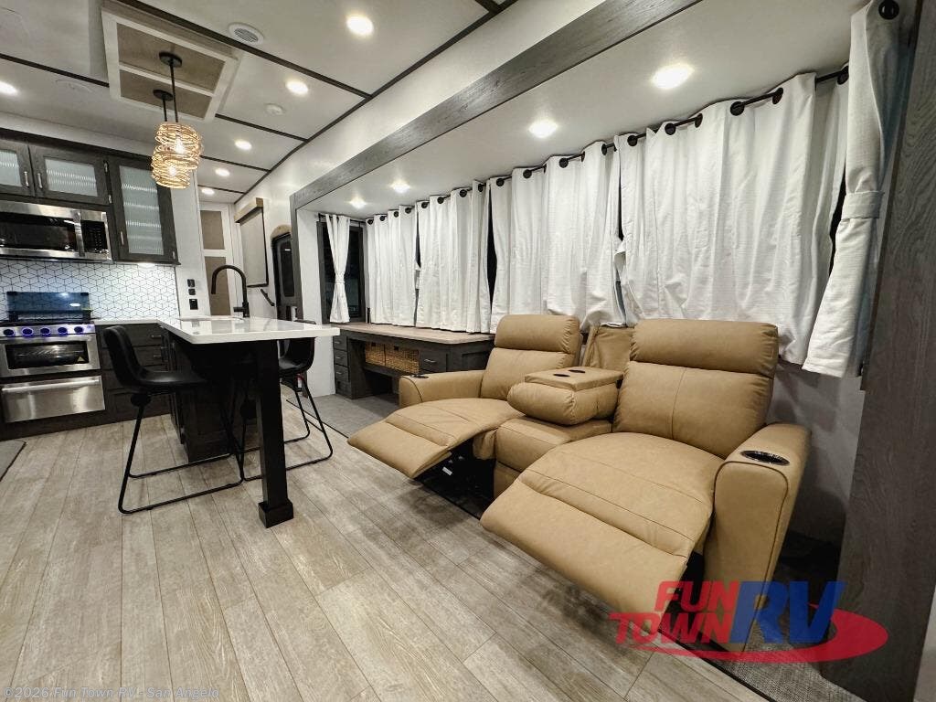 Step inside this luxurious fifth wheel that can sleep five each night! The rear tri-fold hide-a-bed sofa and theater seating provide a relaxing evening by the entertainment center with a 55" TV. Next to the entertainment center is a hidden door with cabinets and 16 cu. ft. 12V refrigerator, and a 36" x 74" flip-down bunk with storage. The kitchen has plenty of countertop space to prepare your best home cooked meals and an island with four bar stools to enjoy your meals. You also have a desk with storage to get some work done if needed. As you walk up the floating steps, you will notice the full bathroom to your left with a walk-in shower with a skylight for added natural lighting and a dual sink vanity for two to get ready at once. The front private bedroom has a king bed with Versa Tilt technology slide, a dresser next to a bench and a front wardrobe that is prepped for a washer and dryer!