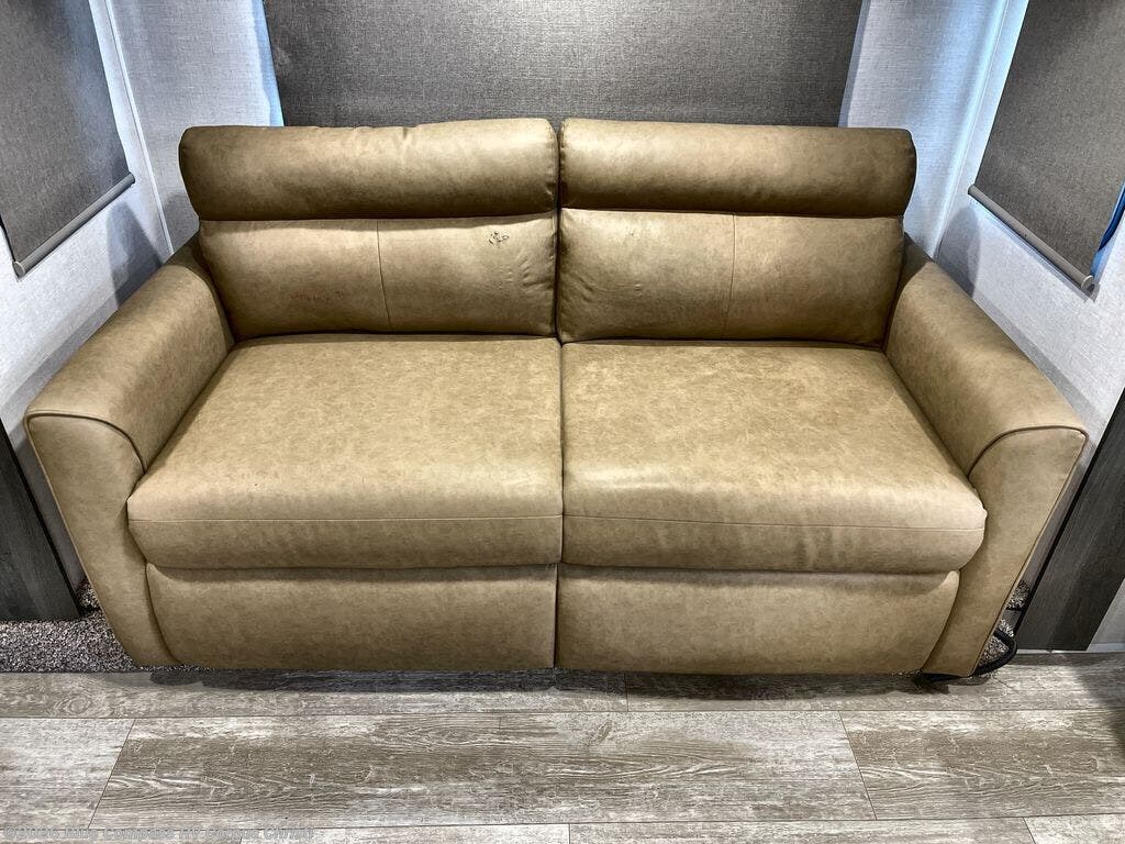 Looking for a separate living area from the kitchen in your next fifth wheel? Would you like to have a private bedroom with a rear window for more natural lighting and beautiful views of your campsite? Stop your search! This Impression includes both of your wishes, plus so much more. The front living area offers dual opposing slides for more floor space, theater seating, and a front wall with a 50" LED TV with soundbar, a fireplace, plus storage for games, and such. The separate kitchen is centrally located and offers a slide out with kitchen appliances and a large pantry, and there is an L-shaped kitchen counter for more prep space and the single bowl sink, plus there is a breakfast bar with bar stools to dine at. The full bathroom includes a walk-in shower, and the rear bedroom allows you to sleep like royalty and hang lots of clothes in the four wardrobes, one of which includes washer/dryer prep!