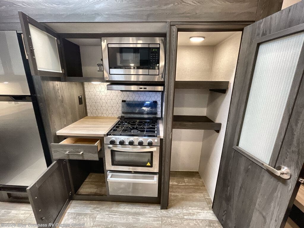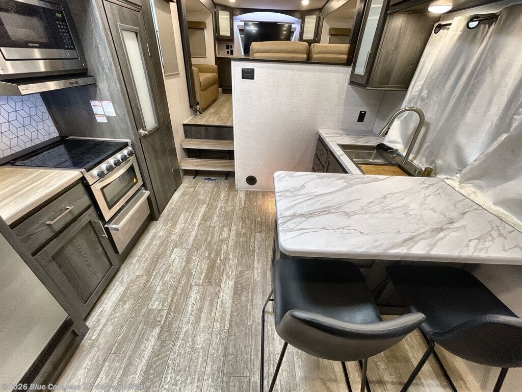Looking for a separate living area from the kitchen in your next fifth wheel? Would you like to have a private bedroom with a rear window for more natural lighting and beautiful views of your campsite? Stop your search! This Impression includes both of your wishes, plus so much more. The front living area offers dual opposing slides for more floor space, theater seating, and a front wall with a 50" LED TV with soundbar, a fireplace, plus storage for games, and such. The separate kitchen is centrally located and offers a slide out with kitchen appliances and a large pantry, and there is an L-shaped kitchen counter for more prep space and the single bowl sink, plus there is a breakfast bar with bar stools to dine at. The full bathroom includes a walk-in shower, and the rear bedroom allows you to sleep like royalty and hang lots of clothes in the four wardrobes, one of which includes washer/dryer prep!