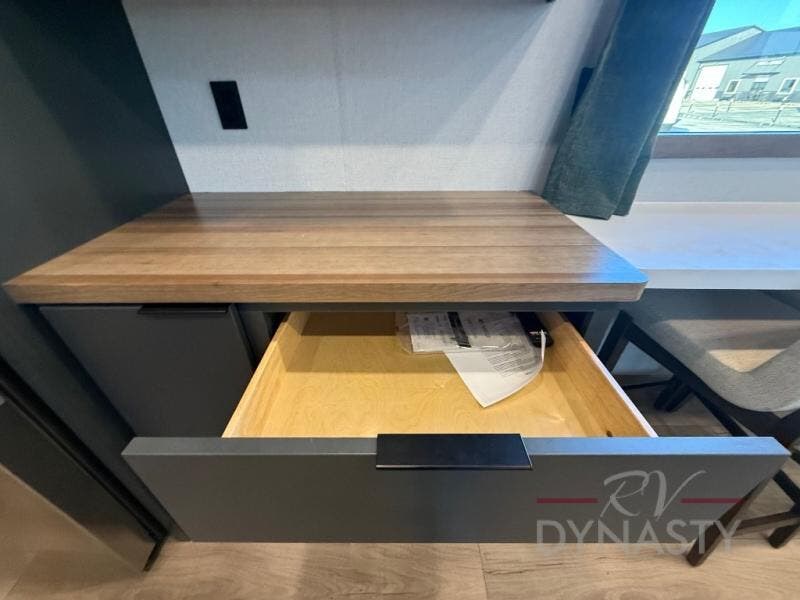 For those who appreciate a destination trailer easier to maintain, this slide-less unit will be perfect for you! Your crew can relax comfortably in the front living area that includes an L-shaped sleeper sofa across from an entertainment center or enjoy the views out the window in front of the countertop with chairs. The full kitchen will allow you to make your best home-cooked meals, and the spacious walk-through bath is easily accessible. You're sure to love the rear bedroom that includes a queen bed with a king bed option, along with dual bedroom closets to keep everything organized!