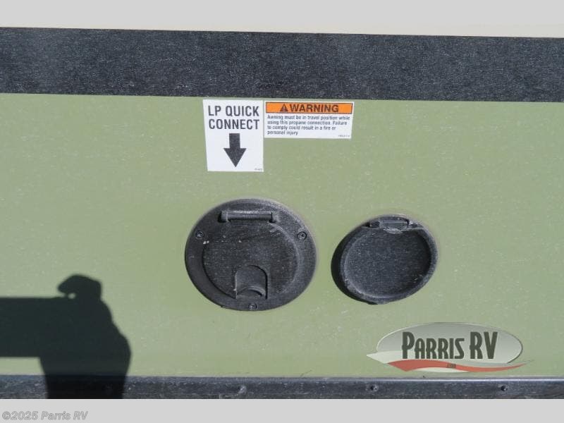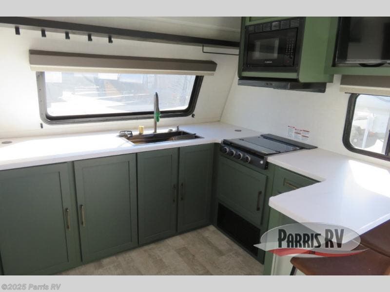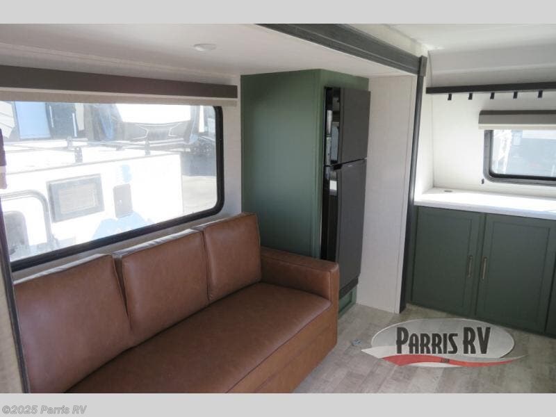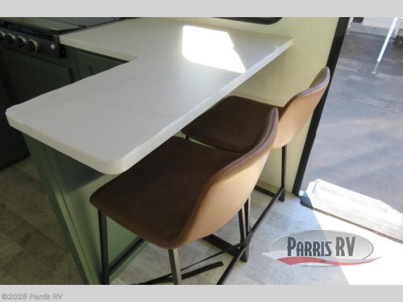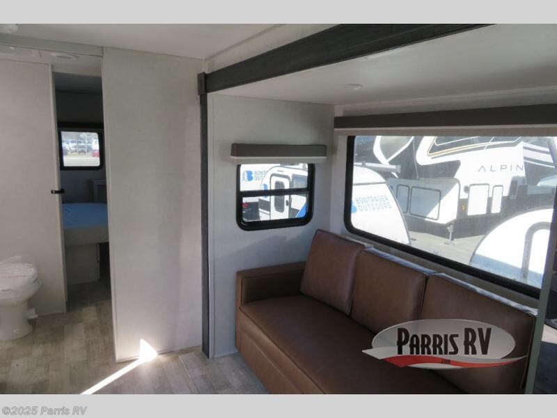 This couple's trailer is perfect for weekend trips or extended stays at the campground. A front kitchen includes generous counter space, along with a bar top and two seats. You can relax on the jackknife sofa slide after breakfast, or head outdoors to sit under the patio awning. The walk-thru bath will lead to the rear master bedroom where you'll find a queen bed and dual wardrobes for your clothes.