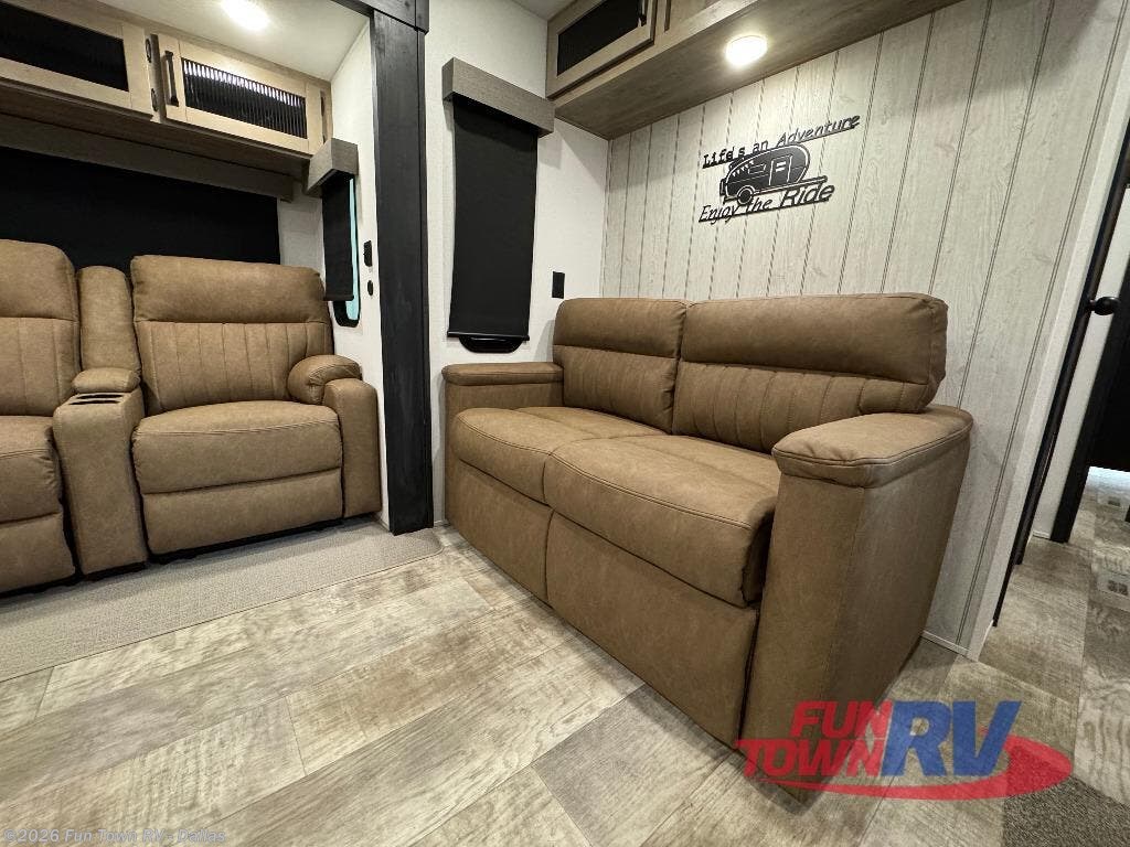 You won't want to camp any other way once you step inside this travel trailer! The rear kitchen has a stainless steel oven and range to prepare your best meals, a 12V refrigerator to keep your perishables fresh, and a walk-in pantry for your canned goods and snacks for movie night. After a fun day at the beach, you can play a card game at the booth dinette, relax in either one of the two recliners and sofa, or rinse the sand out of your hair in the 32" x 40" shower with a seat in the full bathroom. There is also a front private bedroom with a queen bed slide across from a dresser and a front closet with another closet with washer and dryer prep.