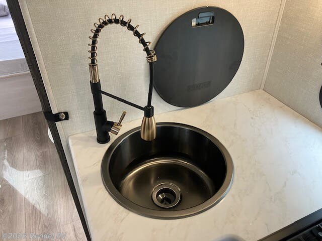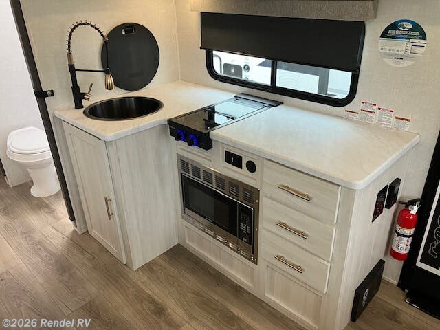 The R-Pod is equipped with modern amenities to enhance your camping experience. Enjoy cooking with a convection microwave and stove top burner, while the tankless water heater guarantees endless hot water. You'll find a 12V refrigerator, air conditioning, and a central vacuum system, making it a well-appointed retreat.
