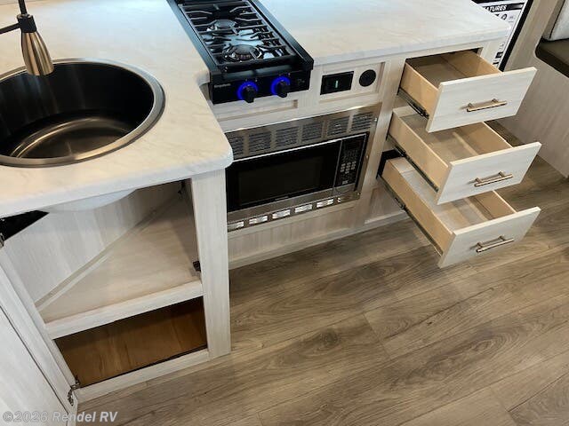 The RP-198 boasts a 25 feet 6 inches length and an impressive 8 feet width, offering ample living space without compromising on towability. Built with an aluminum welded structure and a fiberglass exterior, this RV ensures durability for all your journeys. The double axles provide stability while traveling, complemented by stylish gold wheels for added flair.