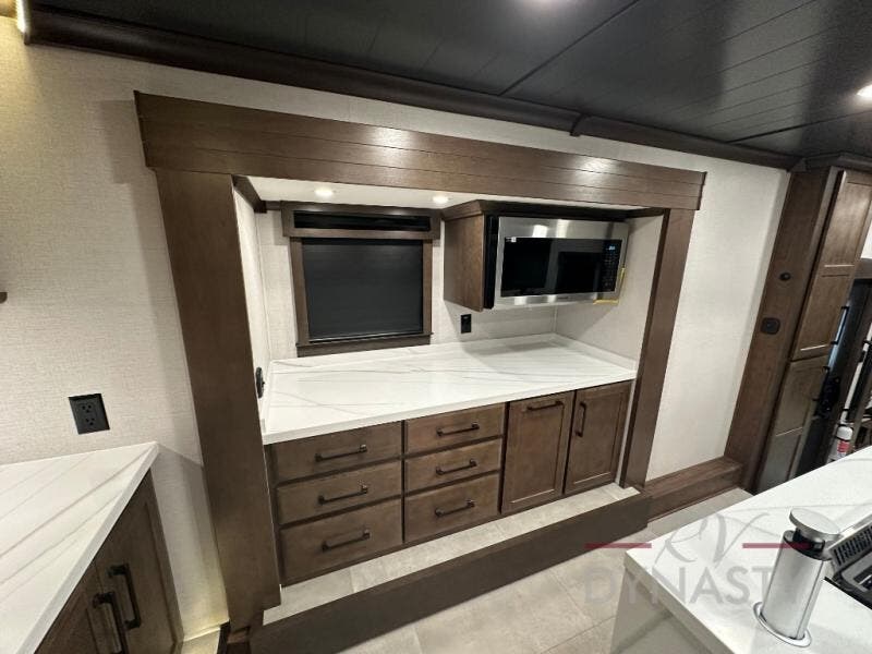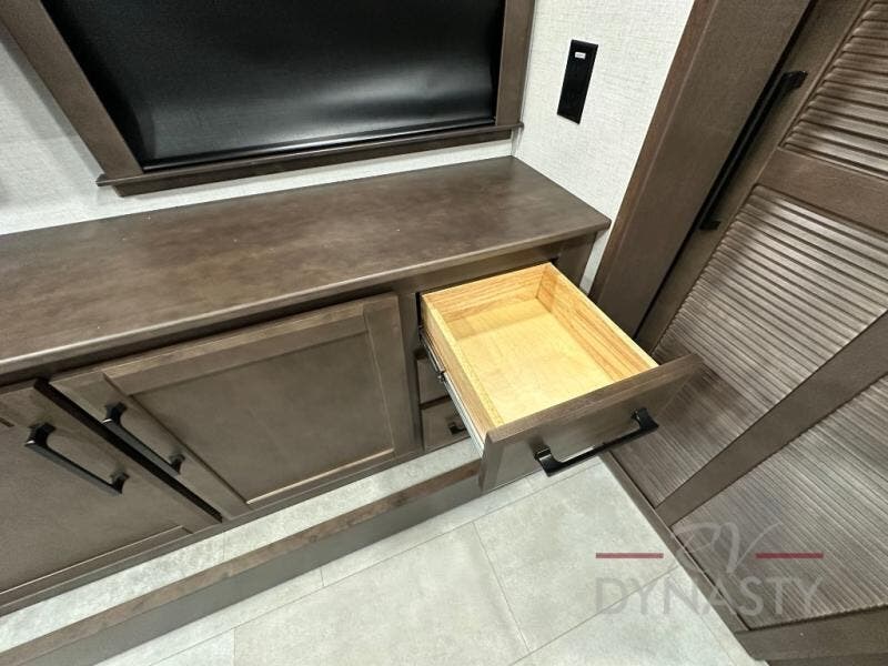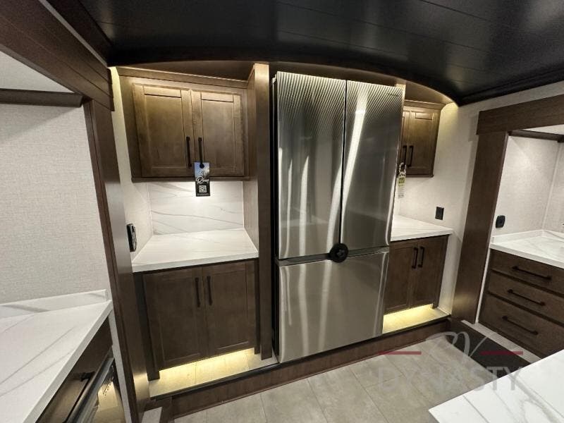 You will feel right at home in this fifth wheel! The rear private bedroom has a 72" x 80" king bed slide for a good night's rest, a rear large wardrobe with the washer and dryer next to it, and even a dresser with a 40" LED TV. And two can get ready at once in the full bathroom with the dual sink vanity. You can then head to either the desk slide to get some work done or whip up some scrambled eggs on the three burner cooktop at the island in the front kitchen. The kitchen even has a dishwasher for easy clean up and two bar stools at the high top dinette that overlooks the middle living area. Relax each night in true comfort on either the E-Z Glide sofa bed slide or the theater seating across from the entertainment center which has a fireplace and 65" Samsung LED Smart TV to watch your favorite movies!