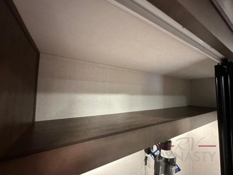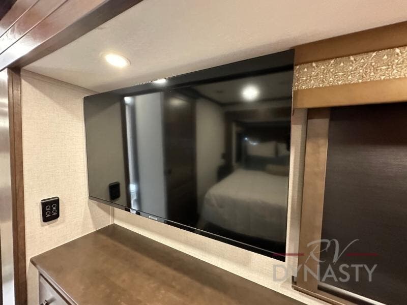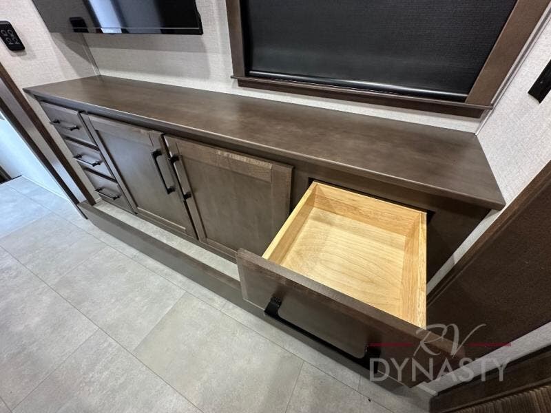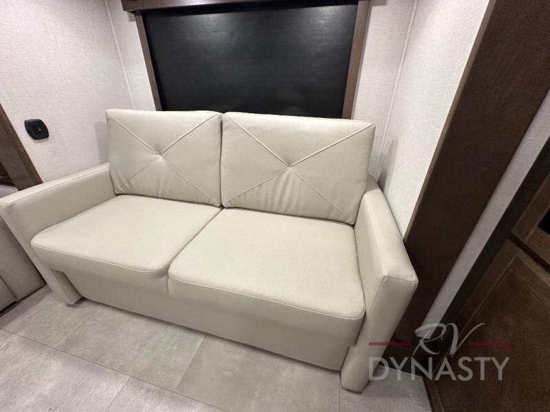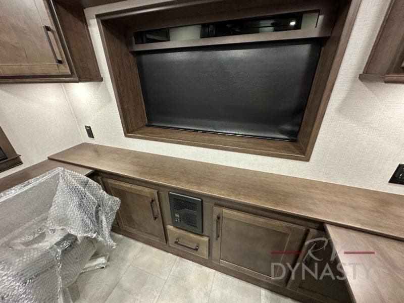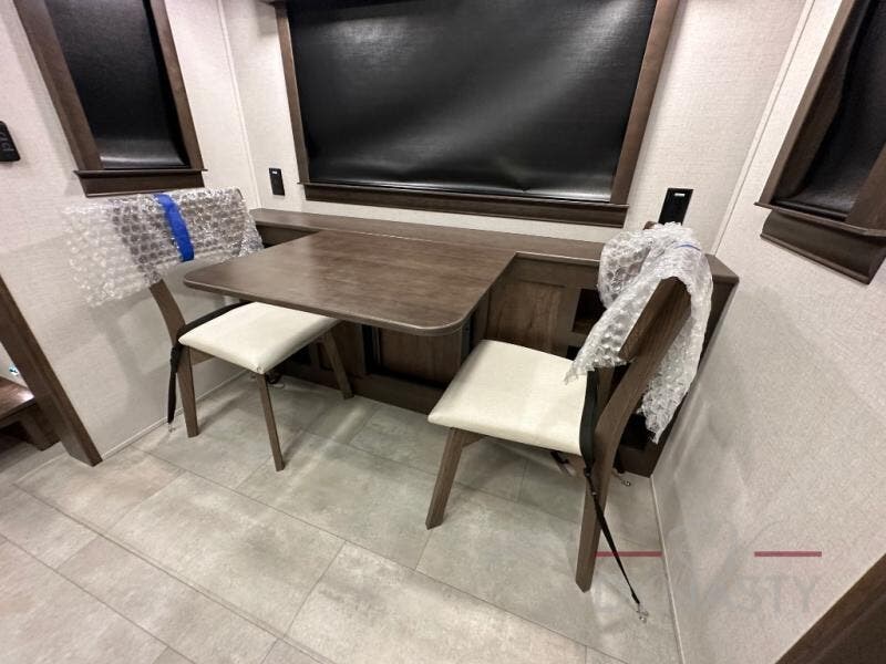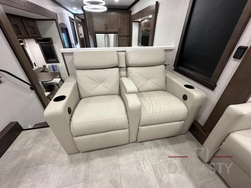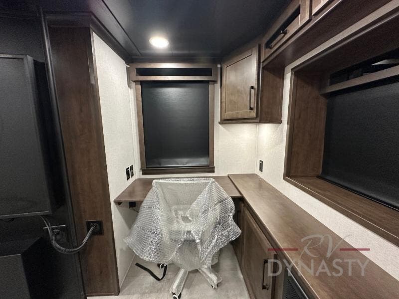 Pack your bags and head to your most comfortable camping trip ever in this award winning fifth wheel! The rear private bedroom has a 72" x 80" king bed slide for a good night's rest, a rear large wardrobe with the washer and dryer next to it, and even a dresser with a 40" LED TV. Get ready in the full bathroom with the shower then head to either the pull-out dinette to read the morning paper or whip up some scrambled eggs on the three burner cooktop in the middle kitchen. The kitchen even has two pantries for all your favorite snacks and a coat rack to hang your jacket. You can relax in the evenings on the two E-Z Glide sofa beds or the theater sofa across from the 65" Samsung LED Smart TV. What's behind the swiveling entertainment center is where the real convenience is found with this model; a hidden front office with ample counter space to get your work done!