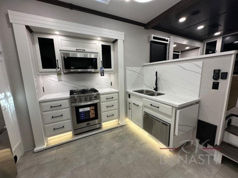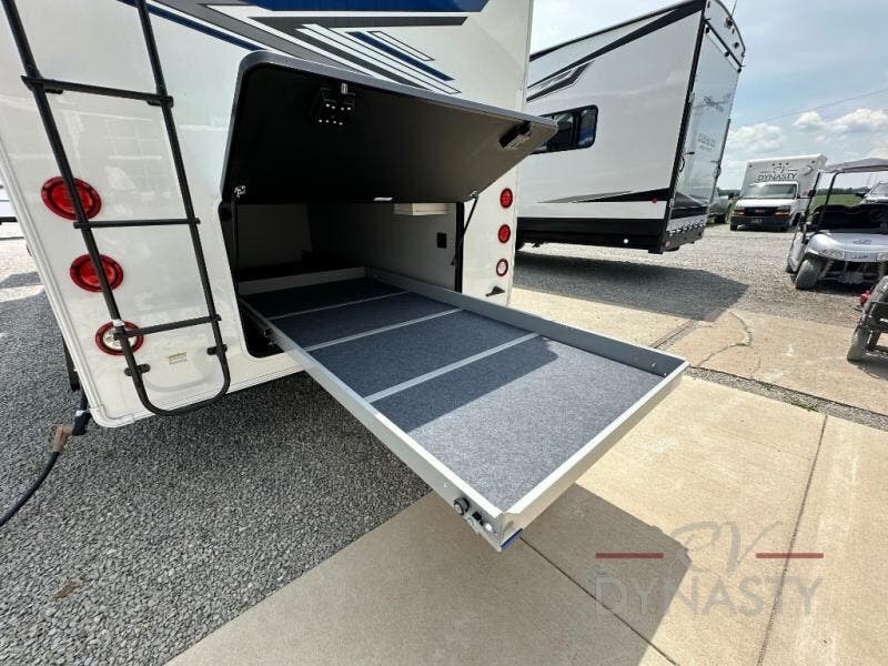 The Forest River RiverStone fifth wheels and toy haulers are luxurious units that have it all! You'll find an automatic six-point hydraulic level-up system to keep your unit in place, and there is preparation for a four-camera observation system. The TravlFi Journey XTR 4G/LTE router and WiFi extender will help you stay connected to the outside world, and you'll never have to overpack again since the Splendid “Astral” stackable washer and dryer will let you clean the small amount of clothes you've brought with you. Another high luxury is the Fischer Paykal dishwasher which will allow you to spend more time enjoying your camp life and less time cleaning up. Each unit is built with a LCI Road Armour suspension system, dual-pane frameless windows, a full docking station, a 200W solar panel, and a BMPro touch control system.