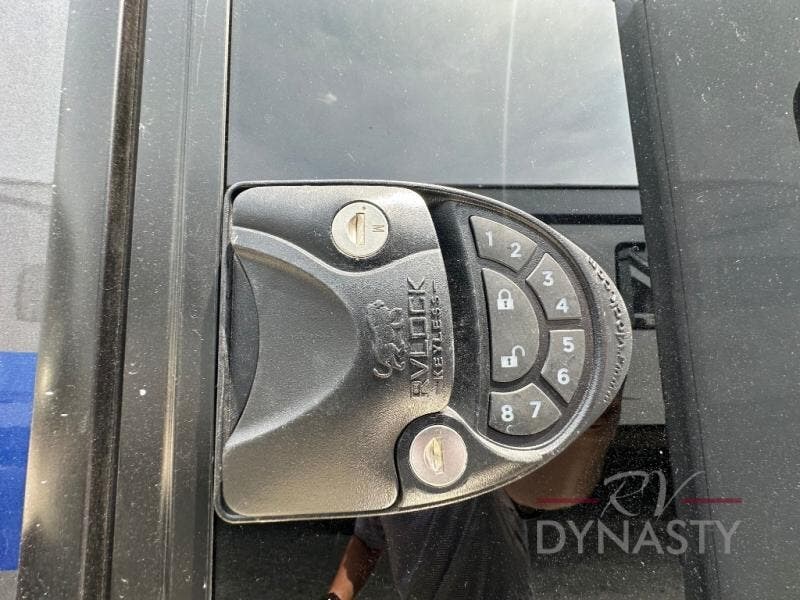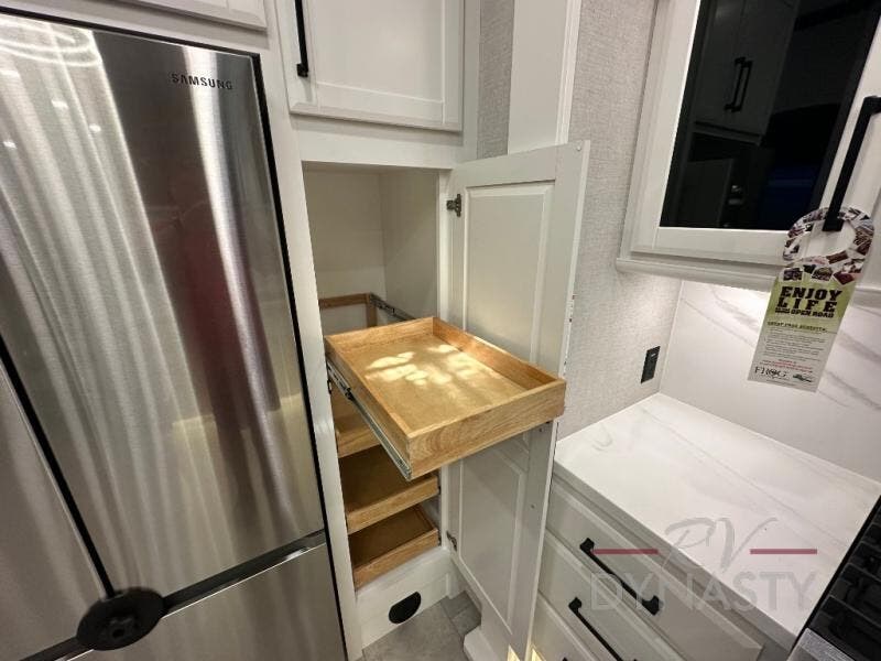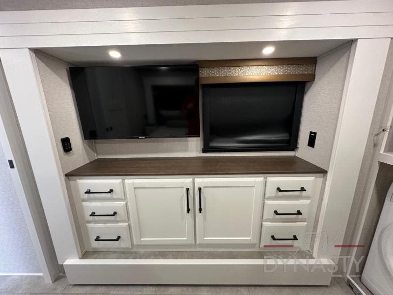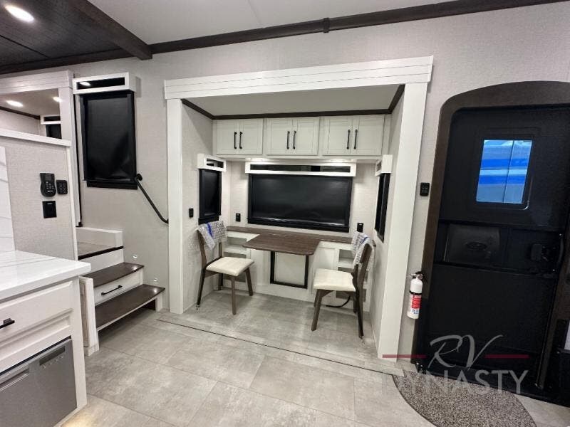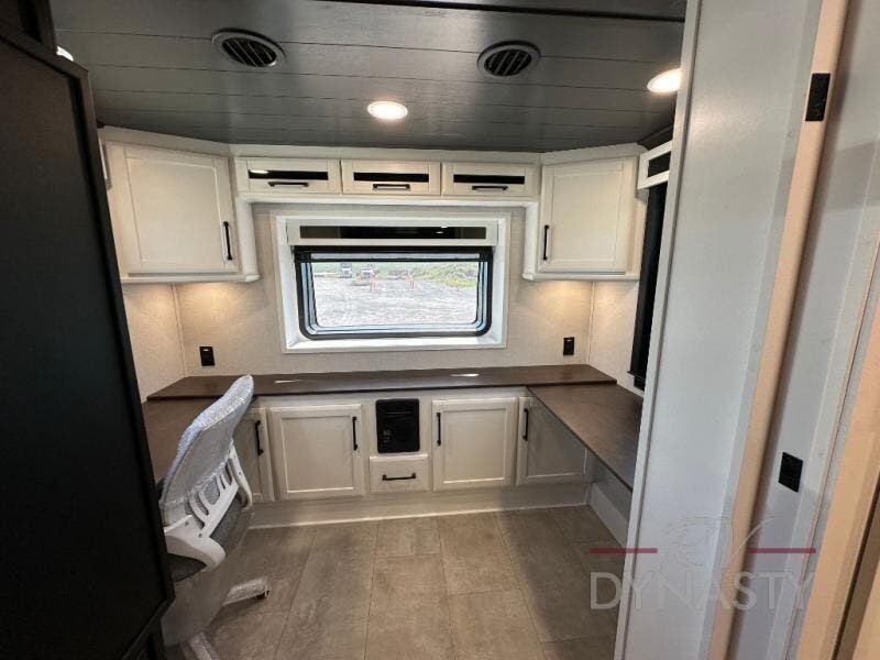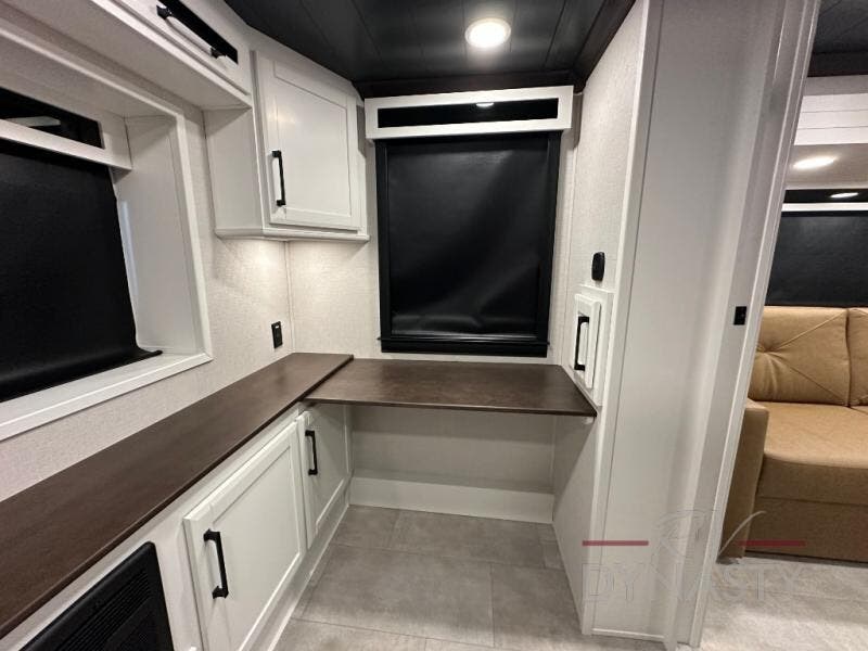 Pack your bags and head to your most comfortable camping trip ever in this packed out fifth wheel! The rear private bedroom has a 72" x 80" king bed slide for a good night's rest, a rear large wardrobe with the washer and dryer next to it, and even a dresser with a 40" LED TV. Get ready in the full bathroom with the shower then head to either the pull-out dinette to read the morning paper or whip up some scrambled eggs on the three burner cooktop in the middle kitchen. The kitchen even has two pantries for all your favorite snacks and a coat rack to hang your jacket. You can relax in the evenings on the two E-Z Glide sofa beds or the theater sofa across from the Samsung LED Smart TV. What's behind the swiveling entertainment center is where the real convenience is found with this model; a hidden front office with ample counter space to get your work done!