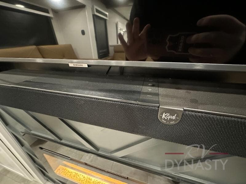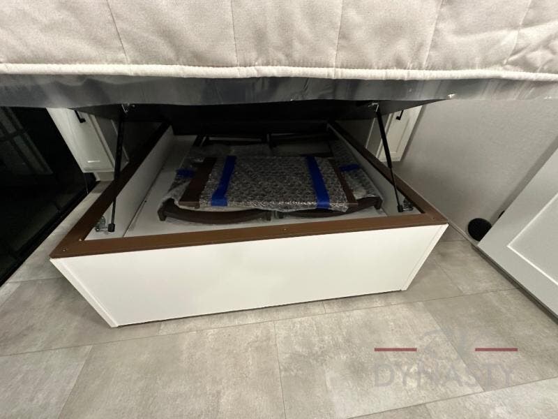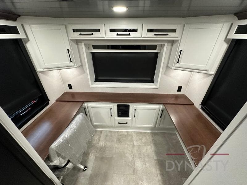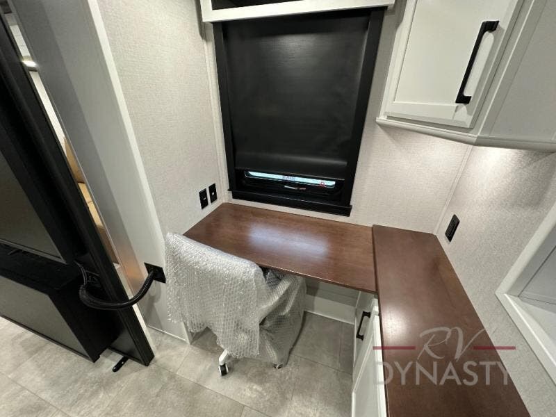 Pack your bags and head to your most comfortable camping trip ever in this packed out fifth wheel! The rear private bedroom has a 72" x 80" king bed slide for a good night's rest, a rear large wardrobe with the washer and dryer next to it, and even a dresser with a 40" LED TV. Get ready in the full bathroom with the shower then head to either the pull-out dinette to read the morning paper or whip up some scrambled eggs on the three burner cooktop in the middle kitchen. The kitchen even has two pantries for all your favorite snacks and a coat rack to hang your jacket. You can relax in the evenings on the two E-Z Glide sofa beds or the theater sofa across from the Samsung LED Smart TV. What's behind the swiveling entertainment center is where the real convenience is found with this model; a hidden front office with ample counter space to get your work done!
