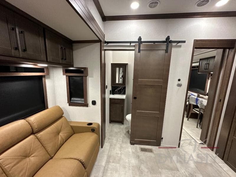 This RiverStone fifth wheel has an amazing den in the back! This area is not only an excellent lounging space with its theater sofa, hide-a-bed sofa, and entertainment center, but it is also a comfortable guest suite because it contains its own half bathroom and a drop-down queen bed. Each section of this unit has opposing slides, so you'll have plenty of living space, and the kitchen area has a pull-out dinette so that you can sit down with hot meals each night. You have a large pantry for snacks and an 18-cubic foot French door refrigerator with ice maker for cold beverages. The ceiling fan allows you to cool off the interior without overworking the AC, and the cordless vacuum will help you clean up messes.