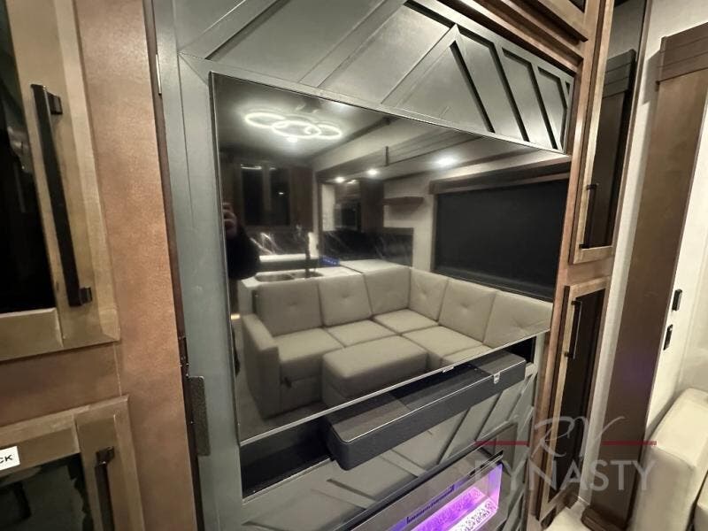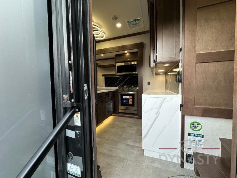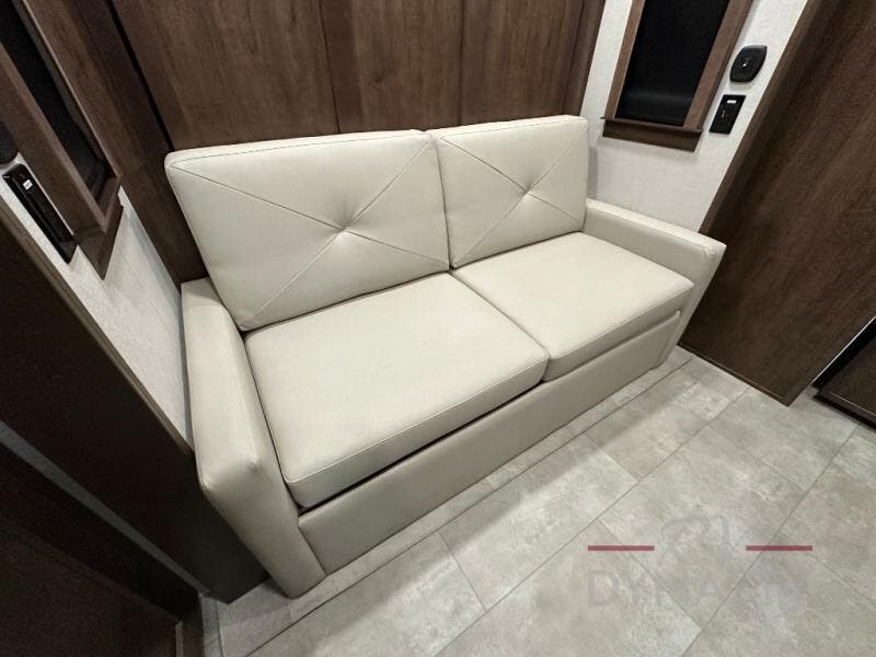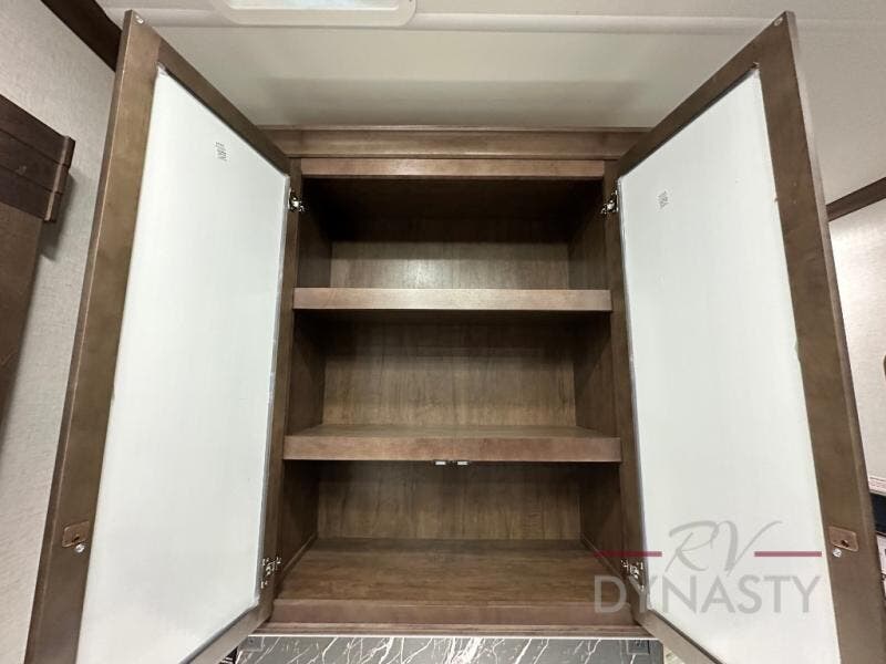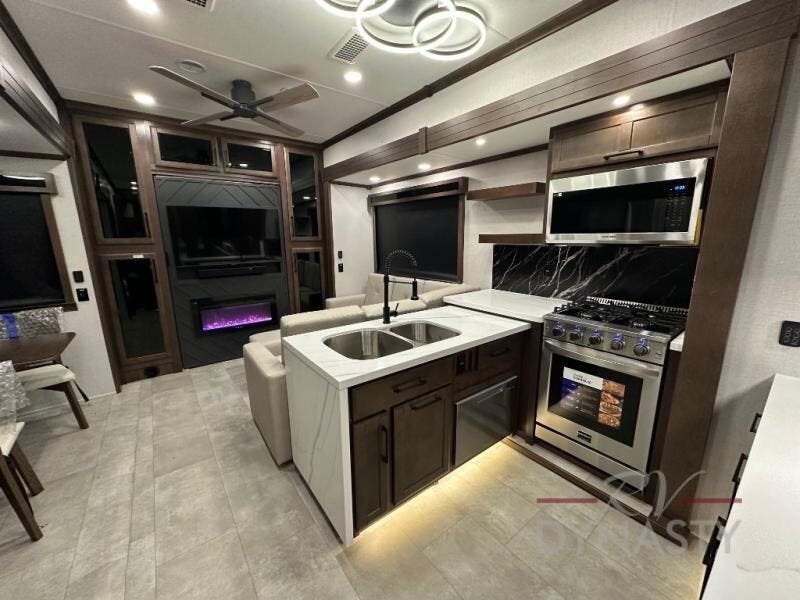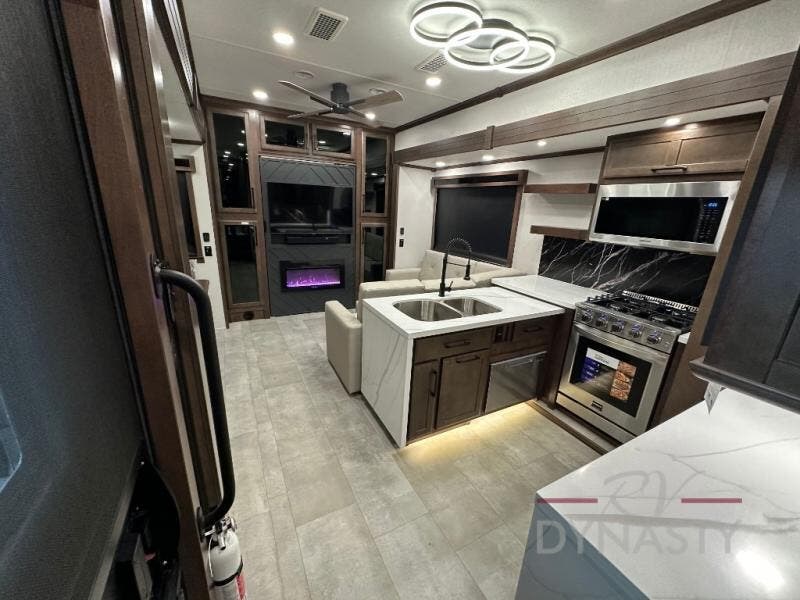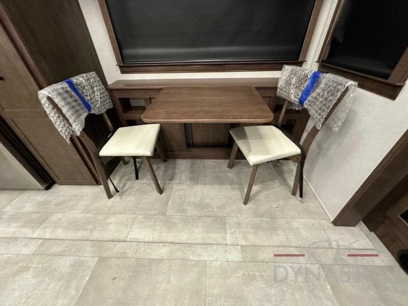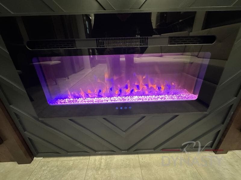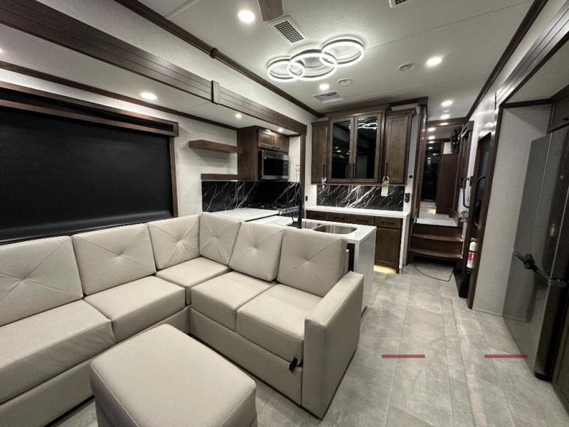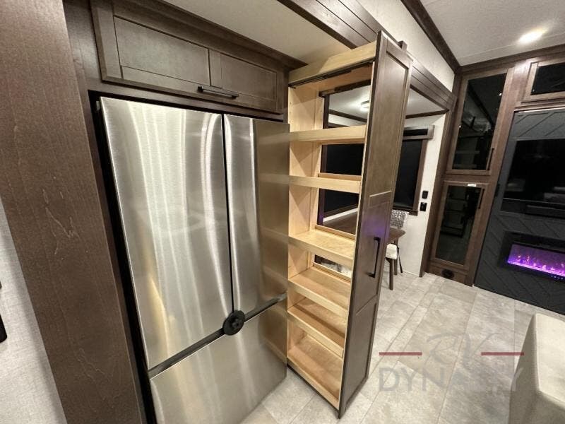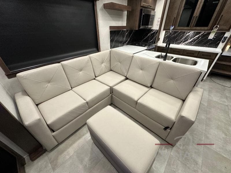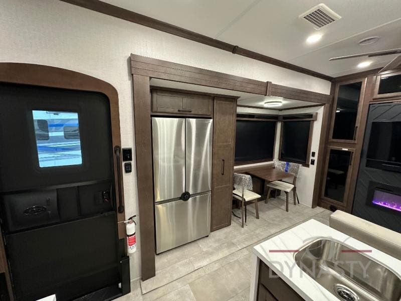 This is the perfect fifth wheel to travel with friends since there are two private bedrooms, one of which is a rear master with a full bath and its own exterior entry door. There is also a Murphy sofa here for your guests to sleep on, along with a wardrobe for their clothes and overhead storage. Head to the front private bedroom where you'll find a king bed slide, a dresser and a bench, a front wardrobe, plus a washer and dryer to make life at the campground easier than ever. The middle of this unit features the kitchen and living area. There is plenty of counter space plus a hutch and pantry for added storage. A sectional sofa provides tons of comfort, especially since its in perfect view of the fireplace and swinging entertainment center. There is also a dinette with four chairs where you can dine together and play a game of cards in the evening!