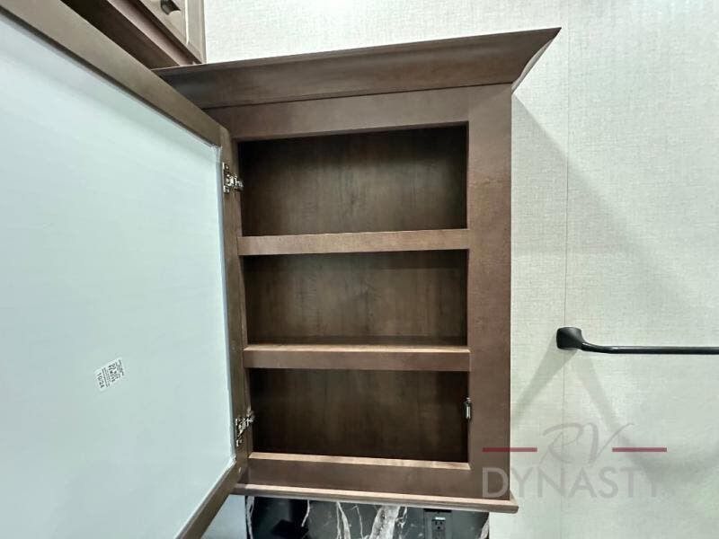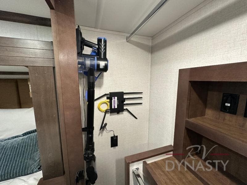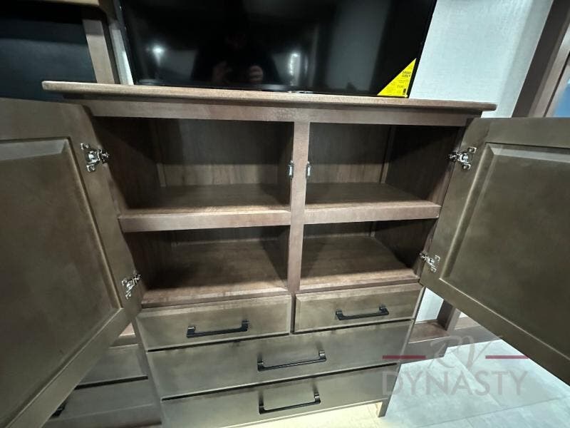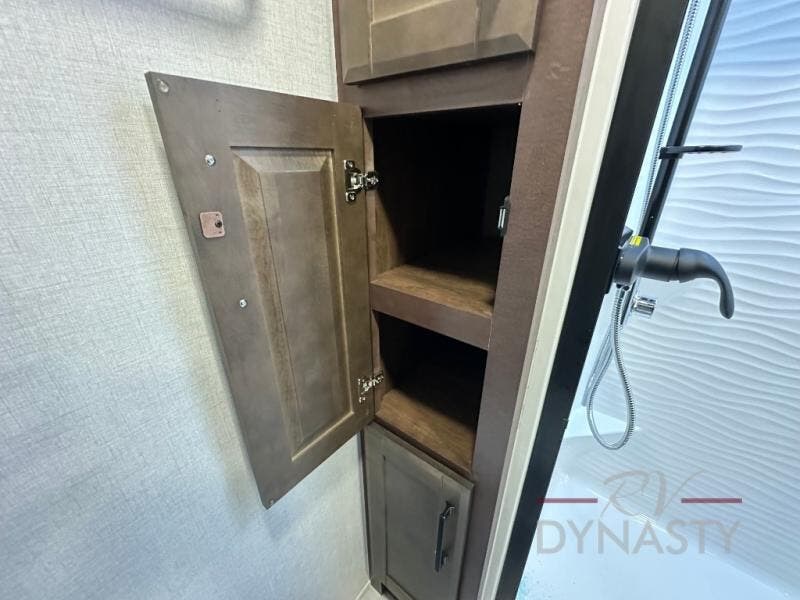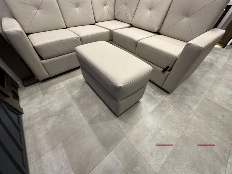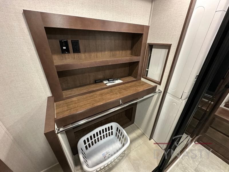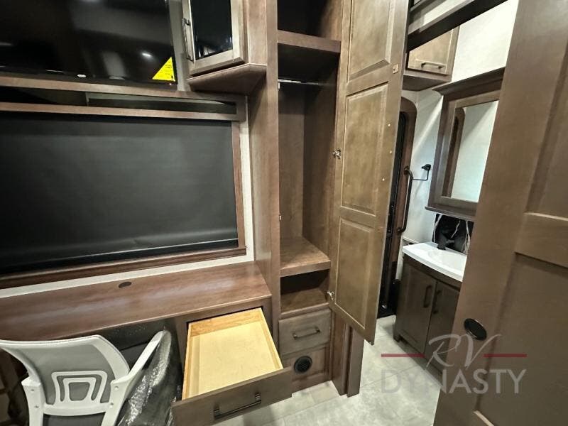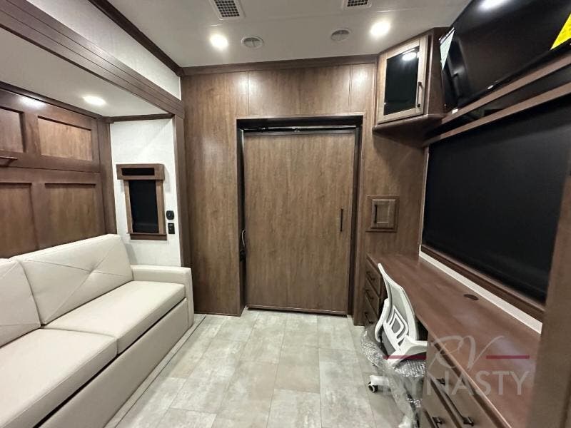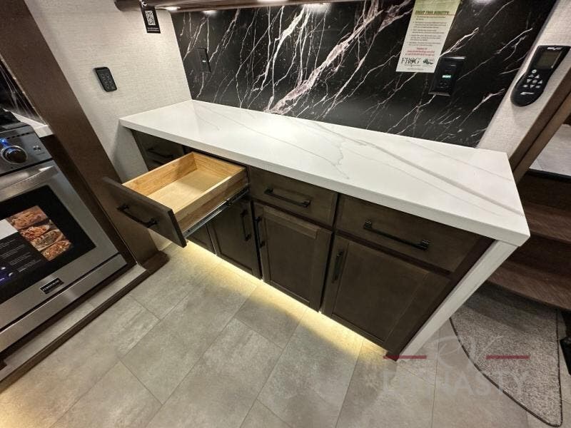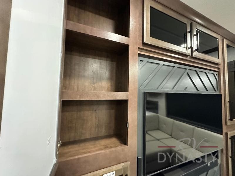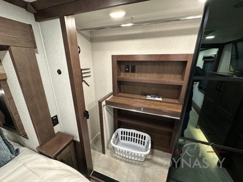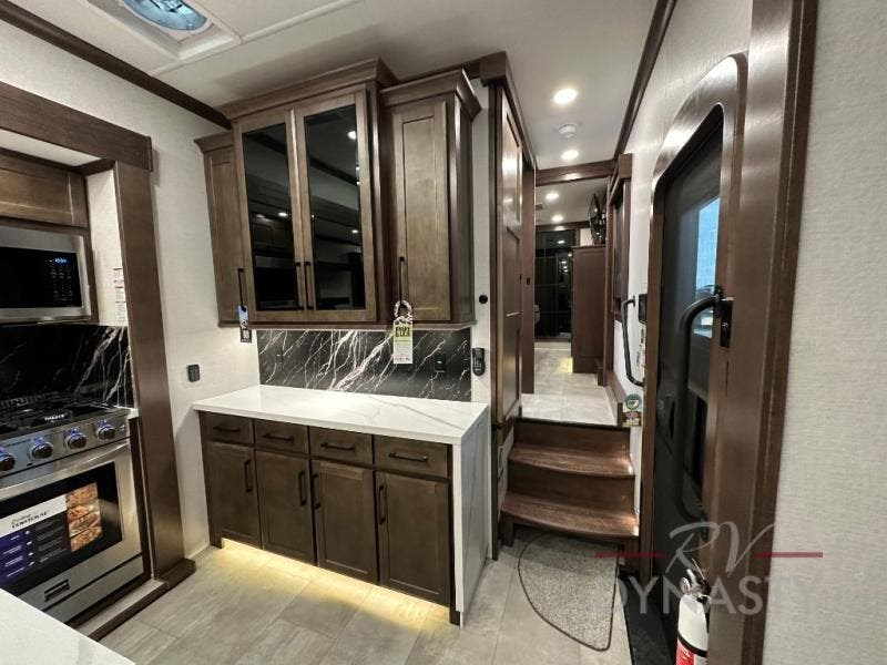 This is the perfect fifth wheel to travel with friends since there are two private bedrooms, one of which is a rear master with a full bath and its own exterior entry door. There is also a Murphy sofa here for your guests to sleep on, along with a wardrobe for their clothes and overhead storage. Head to the front private bedroom where you'll find a king bed slide, a dresser and a bench, a front wardrobe, plus a washer and dryer to make life at the campground easier than ever. The middle of this unit features the kitchen and living area. There is plenty of counter space plus a hutch and pantry for added storage. A sectional sofa provides tons of comfort, especially since its in perfect view of the fireplace and swinging entertainment center. There is also a dinette with four chairs where you can dine together and play a game of cards in the evening!