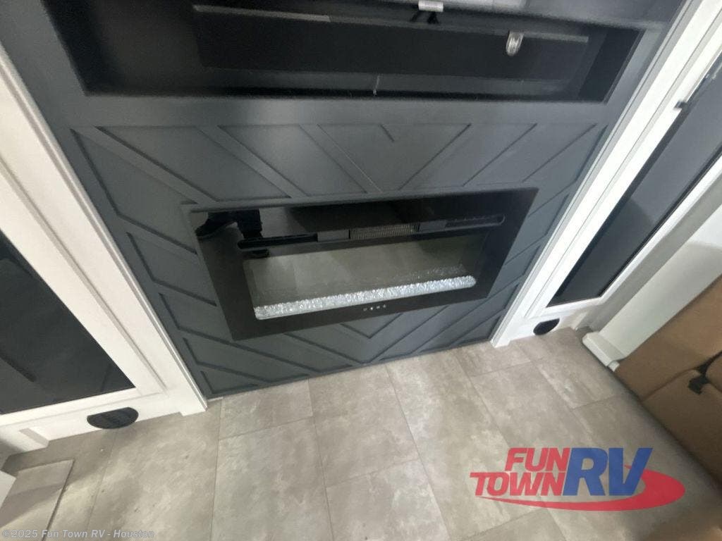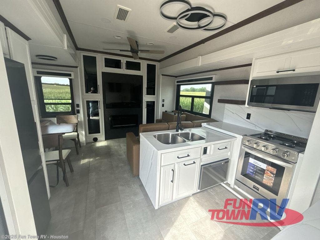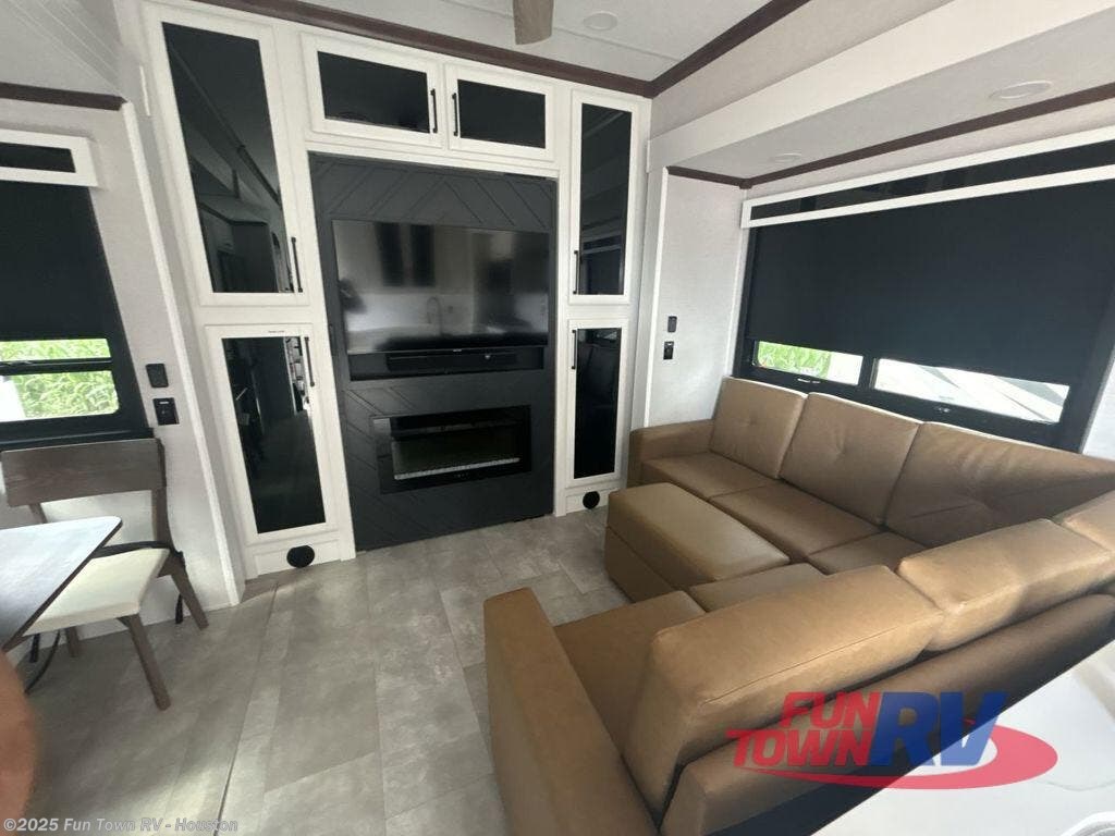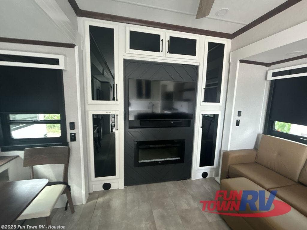 This is the perfect fifth wheel to travel with friends since there are two private bedrooms, one of which is a rear master with a full bath and its own exterior entry door. There is also a Murphy sofa here for your guests to sleep on, along with a wardrobe for their clothes and overhead storage. Head to the front private bedroom where you'll find a king bed slide, a dresser and a bench, a front wardrobe, plus a washer and dryer to make life at the campground easier than ever. The middle of this unit features the kitchen and living area. There is plenty of counter space plus a hutch and pantry for added storage. A sectional sofa provides tons of comfort, especially since its in perfect view of the fireplace and swinging entertainment center. There is also a dinette with four chairs where you can dine together and play a game of cards in the evening!