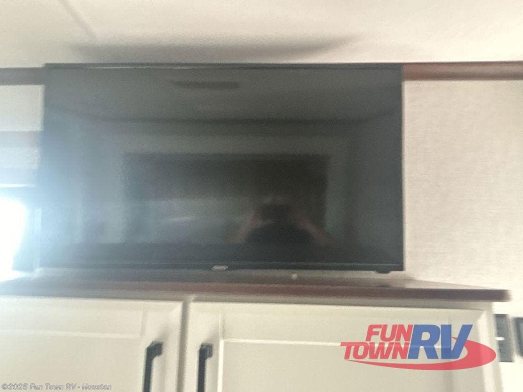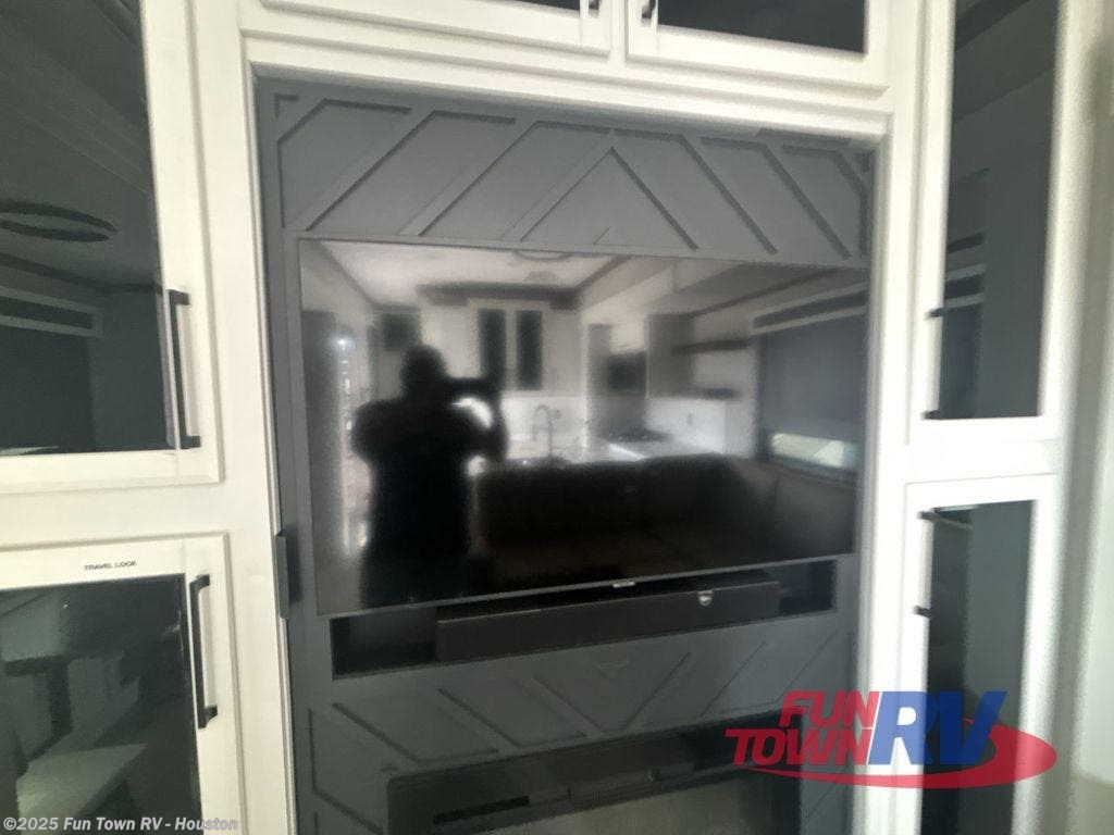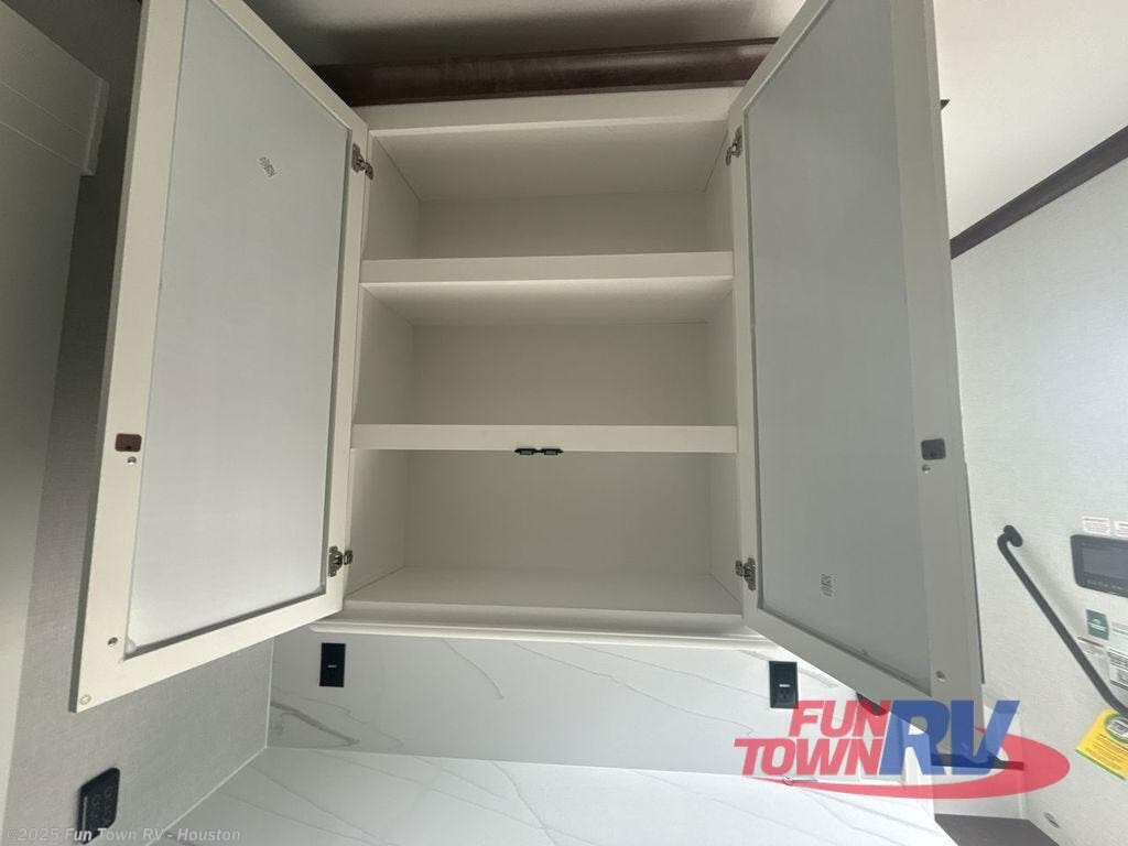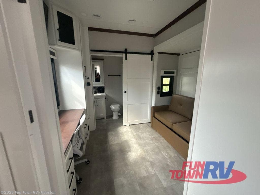 This is the perfect fifth wheel to travel with friends since there are two private bedrooms, one of which is a rear master with a full bath and its own exterior entry door. There is also a Murphy sofa here for your guests to sleep on, along with a wardrobe for their clothes and overhead storage. Head to the front private bedroom where you'll find a king bed slide, a dresser and a bench, a front wardrobe, plus a washer and dryer to make life at the campground easier than ever. The middle of this unit features the kitchen and living area. There is plenty of counter space plus a hutch and pantry for added storage. A sectional sofa provides tons of comfort, especially since its in perfect view of the fireplace and swinging entertainment center. There is also a dinette with four chairs where you can dine together and play a game of cards in the evening!