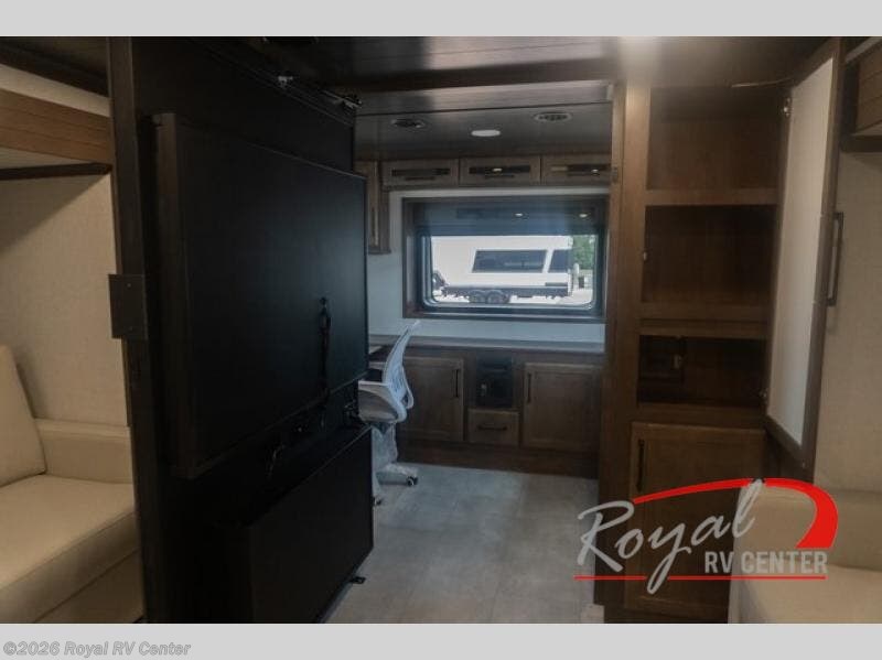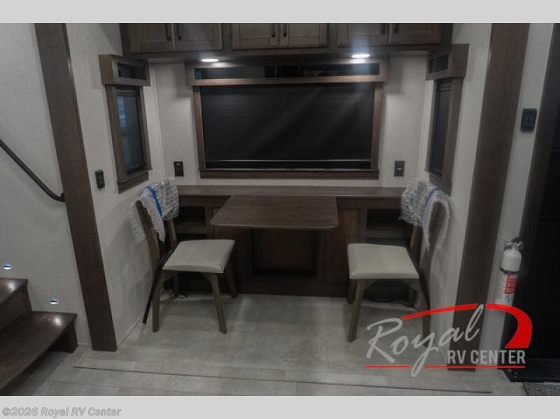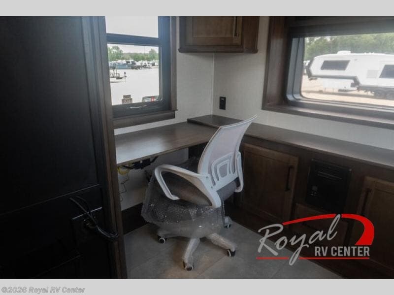 Pack your bags and head to your most comfortable camping trip ever in this packed out fifth wheel! The rear private bedroom has a 72" x 80" king bed slide for a good night's rest, a rear large wardrobe with the washer and dryer next to it, and even a dresser with a 40" LED TV. Get ready in the full bathroom with the shower then head to either the pull-out dinette to read the morning paper or whip up some scrambled eggs on the three burner cooktop in the middle kitchen. The kitchen even has two pantries for all your favorite snacks and a coat rack to hang your jacket. You can relax in the evenings on the two E-Z Glide sofa beds or the theater sofa across from the Samsung LED Smart TV. What's behind the swiveling entertainment center is where the real convenience is found with this model; a hidden front office with ample counter space to get your work done!