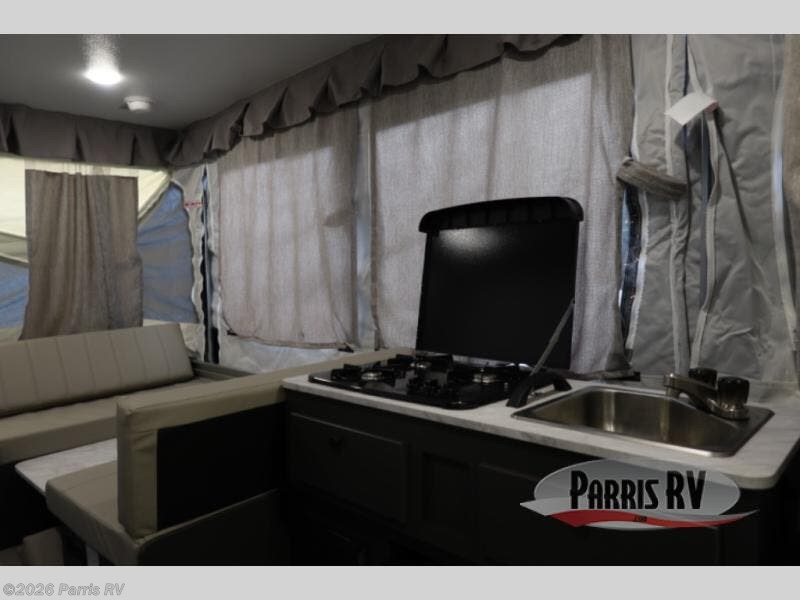 This Rockwood Freedom Series folding pop-up camper is going to let you camp in freedom! You will be able to use the permanently mounted three burner range to cook up some delicious food, and the 9' awning with an LED light will keep you protected while you work. You will also find that the booth dinette with added seating will be useful for both meal time and bed time when the two tent end beds aren't enough space, and the storage lid under the front bed provides storage for luggage, blankets, and more!