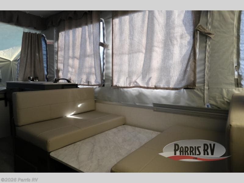 This Rockwood Freedom Series folding pop-up camper is going to let you camp in freedom! You will be able to use the outdoor griddle to cook up some delicious food, and the 9' awning with an LED light will keep you protected while you work. You will also find that the booth dinette will be useful for both meal time and bed time when the two tent end beds aren't enough space, and the storage lid under the front bed provides storage for luggage, blankets, and more!
