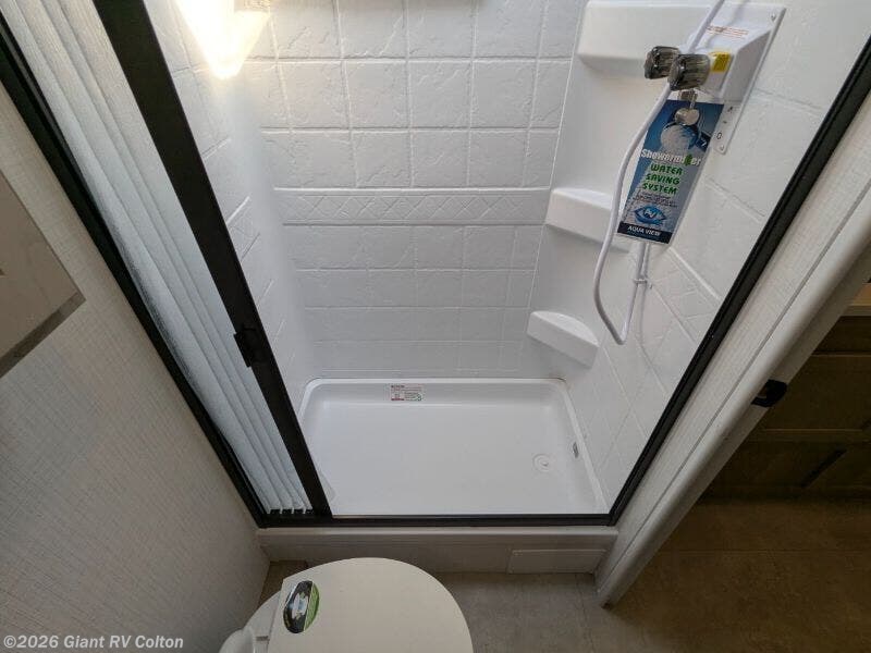 - Fixed Full-Size Bathroom offering a shower, sink and storage in a compact footprint—comfort meets convenience.