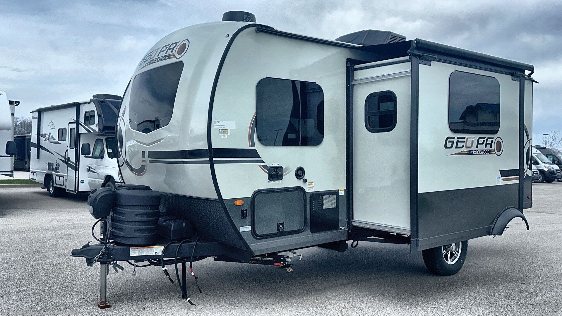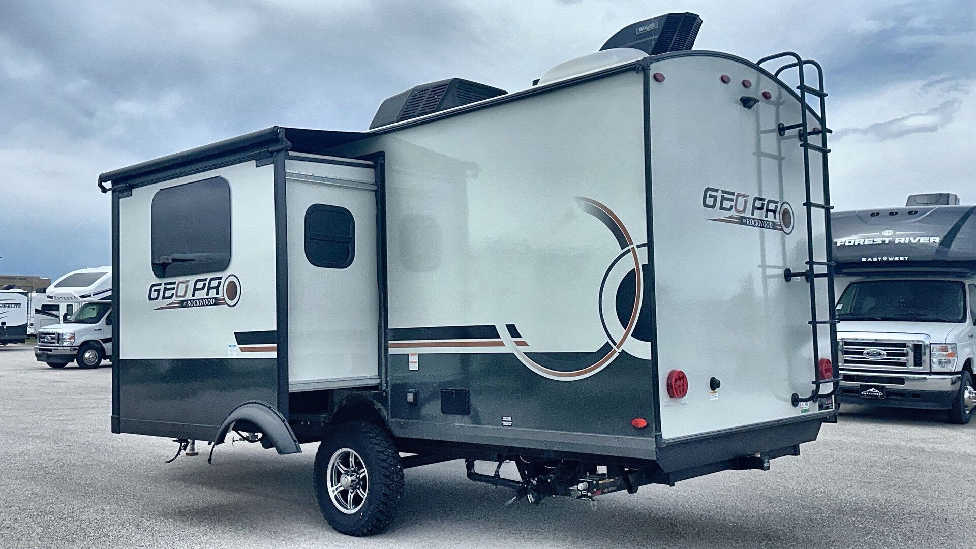 With any Rockwood GEO Pro travel trailer by Forest River you will enjoy easy towing, durable construction, and off-road capabilities with larger 15" tires and a lift kit! Each model is constructed with complete composite wall construction for added strength and durability, and the torsion axle, Rubber-Ryde suspension will make towing easier than ever. Inside, you'll find sleek roller shades for added privacy, a 12V refrigerator and a microwave, plus a 20,000 BTU furnace to keep you warm during the colder camping months.