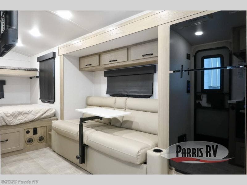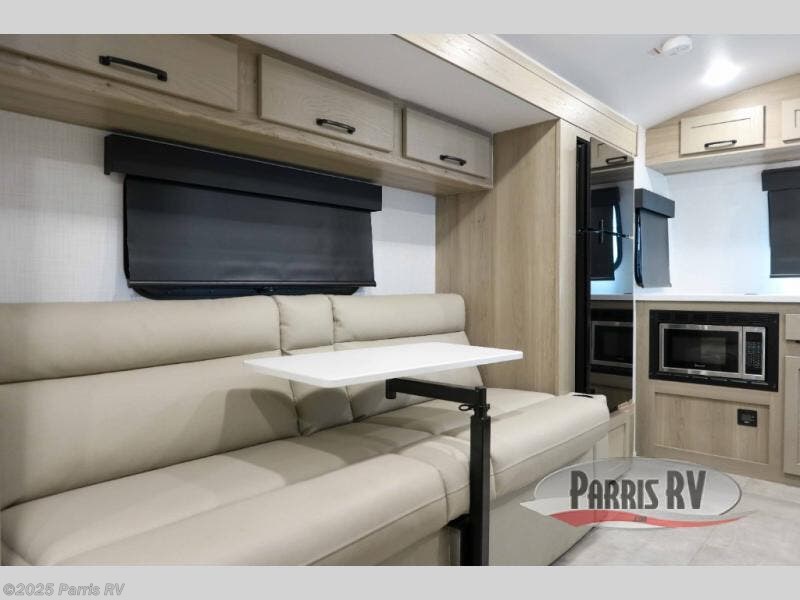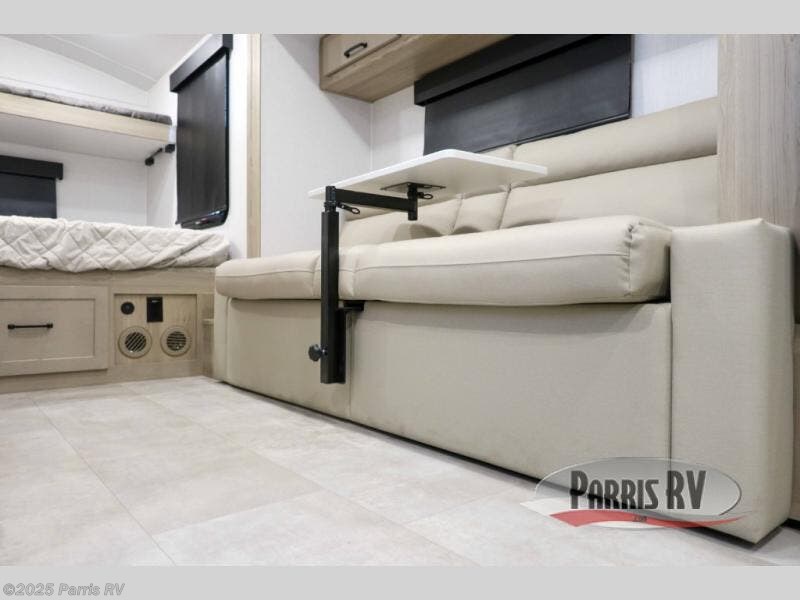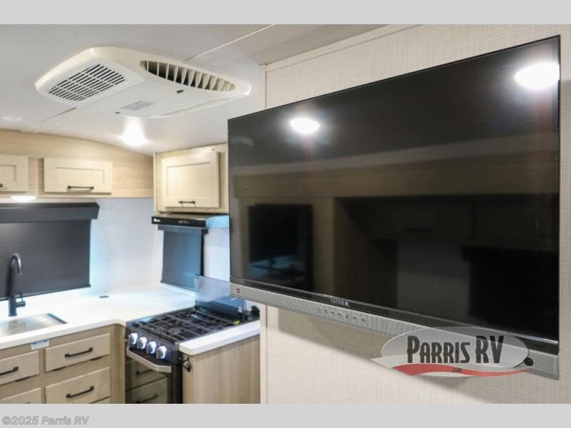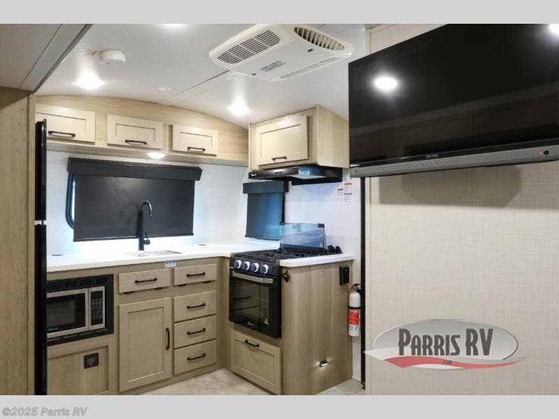 Are you looking for a lightweight trailer with at-home comforts? Take a look at this single slide out unit that can sleep three to four each night. There is a queen-size bed in the back with a 26" x 80" flip-up bunk for cozy sleeping space, a 72" sofa with cupholders to relax on, plus a 32" 12V TV for movie nights! The front kitchen includes a 12V refrigerator to store food, plus a microwave oven and a gas oven to cook meals each day.