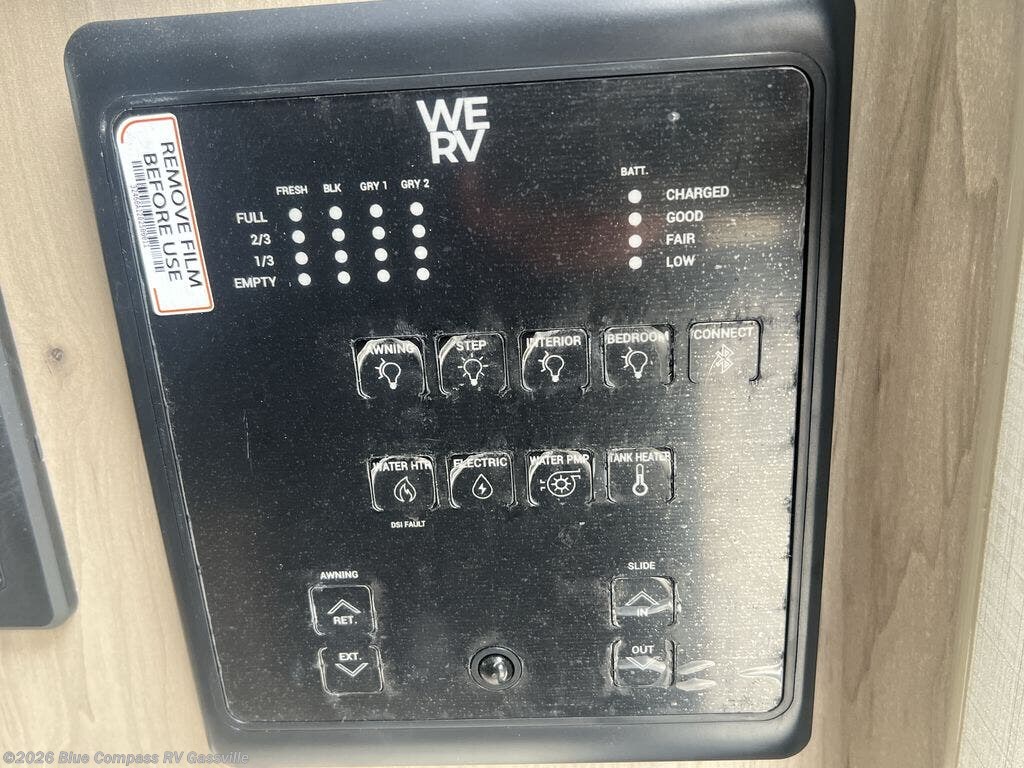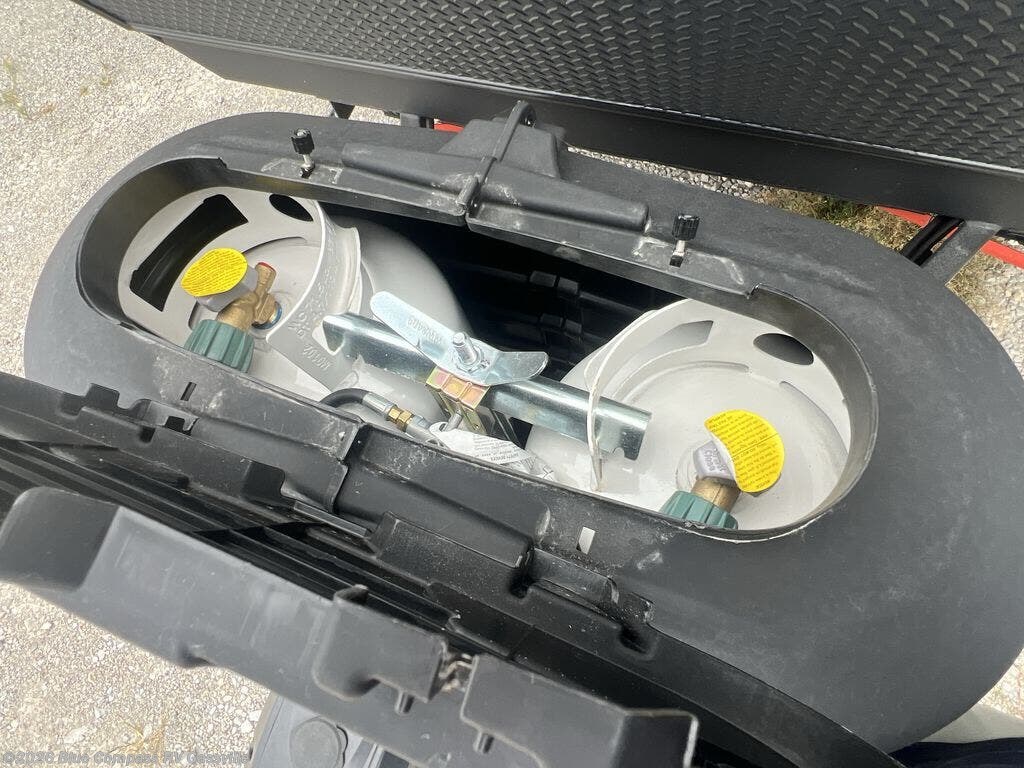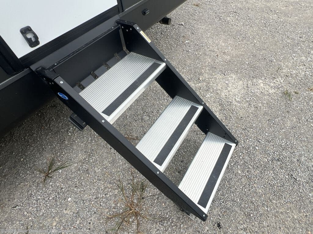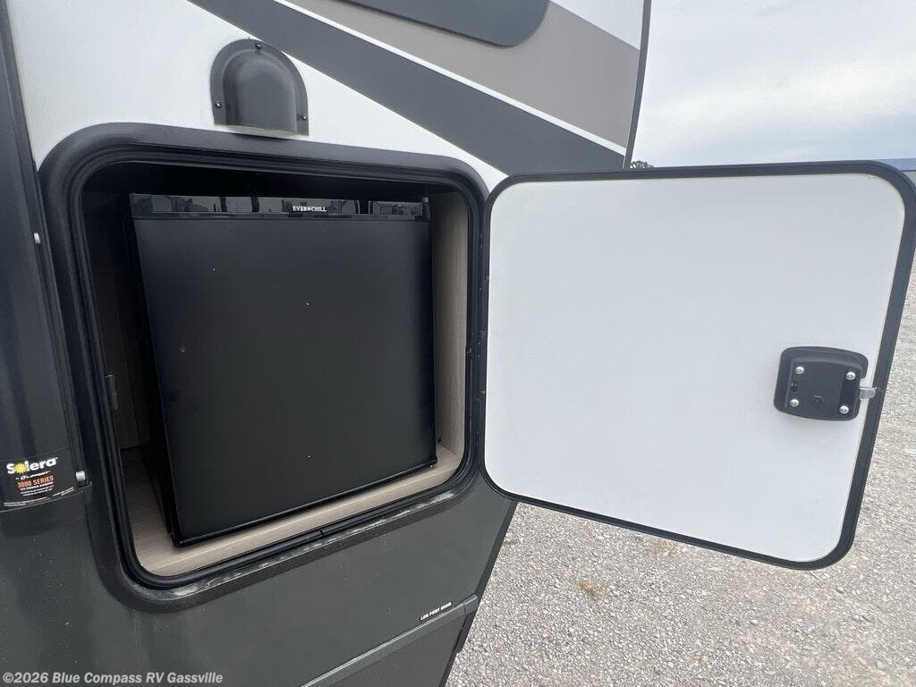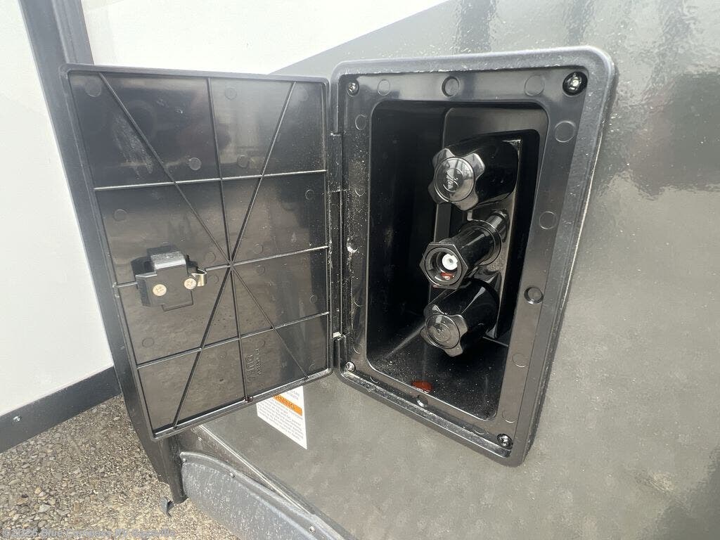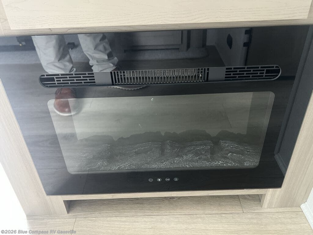 If you like the front kitchen layout, you're going to love this one! You'll have plenty of counter space to prepare and cook meals, or you may just want to head outdoors to cook on the outside griddle. There is a 19' power awning with LED lights to keep you protected from the sun and rain, and there are three exterior storage compartments for lawn chairs, fishing poles, and firewood! This model includes a U-shaped dinette slide in perfect view of the 12V smart entertainment TV and fireplace, and this area can double as your guests' sleeping space at night. You'll stay comfortable in the rear bedroom that includes an RV queen bed, dual bedroom wardrobes, and an optional TV if you enjoy movies in bed!