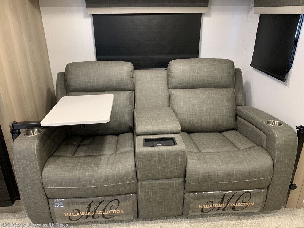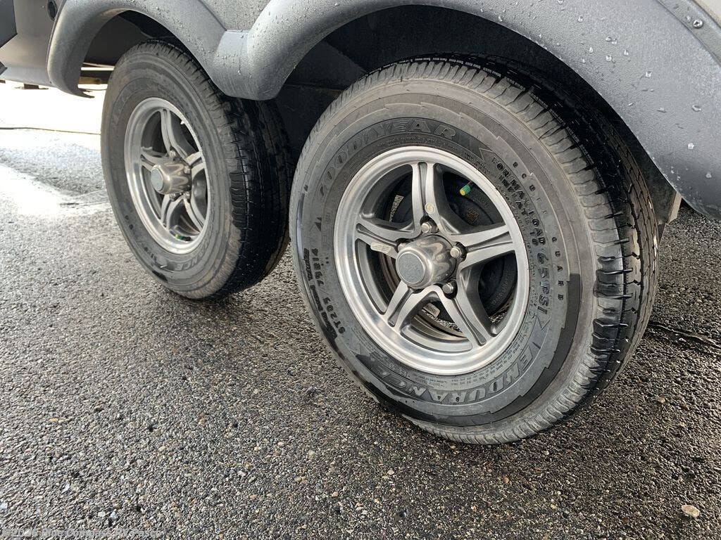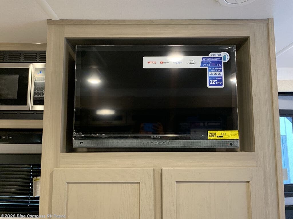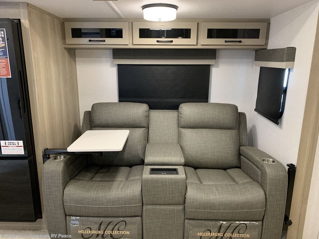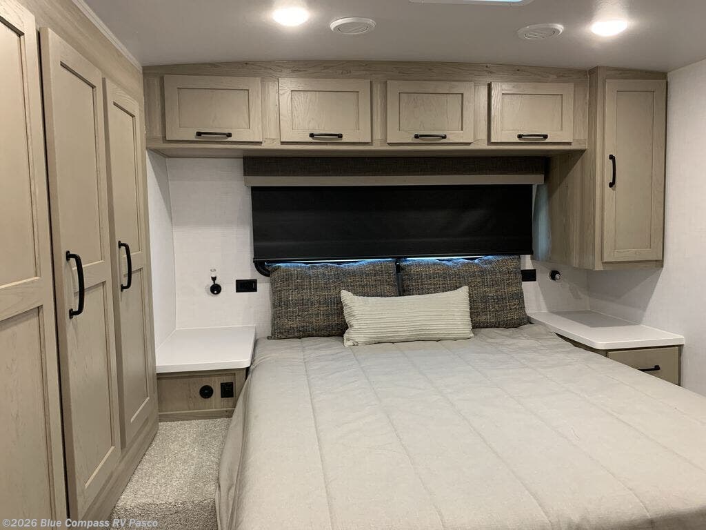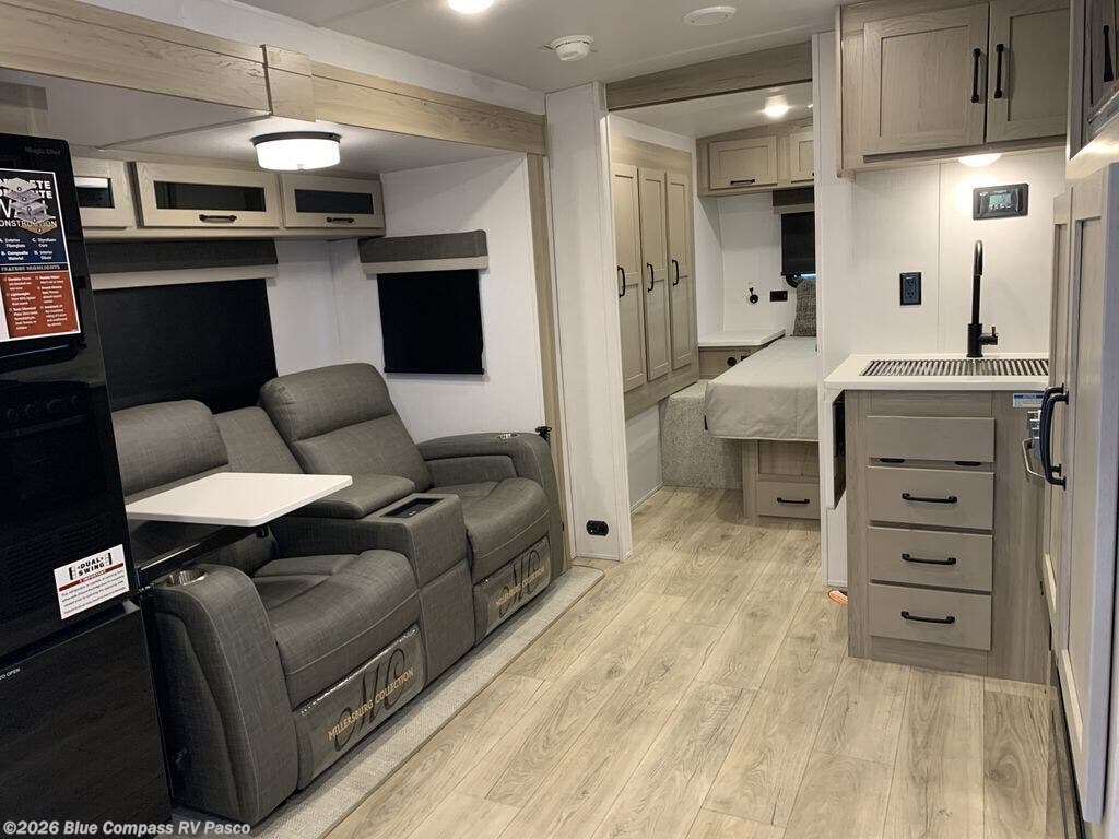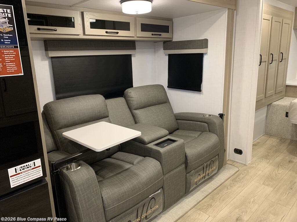 Camping trips to the lake just got sweeter with this dual slide out travel trailer in tow! Once you arrive, unload your gear from the exterior drop-frame pass-through storage, then start lunch on the exterior griddle. If you need a rest after traveling all day, the RV queen bed in the front bedroom is sure to give you comfort, or you can relax on the theater seating. The fireplace and entertainment center with a 32" TV will make this space feel just like home, and check out the spacious full rear bath for added privacy. This model also includes an entryway closet/pantry for jackets, shoes, and food!