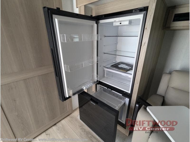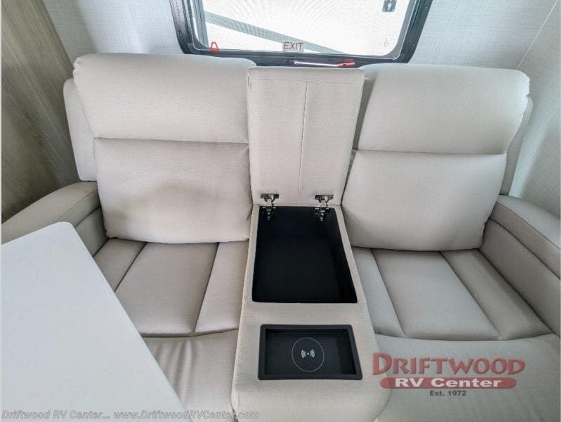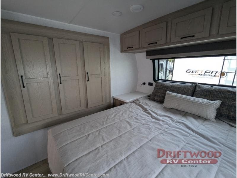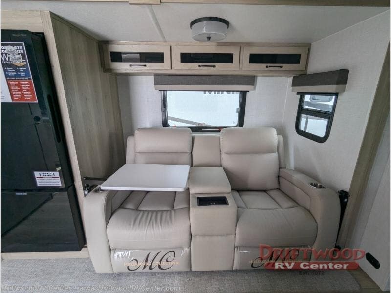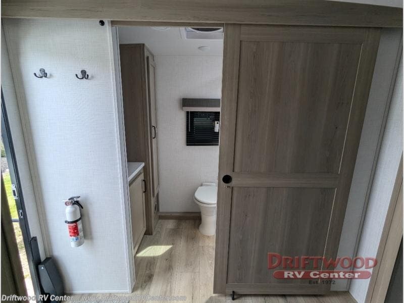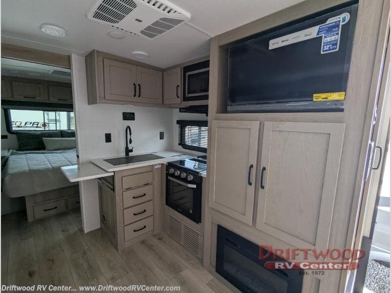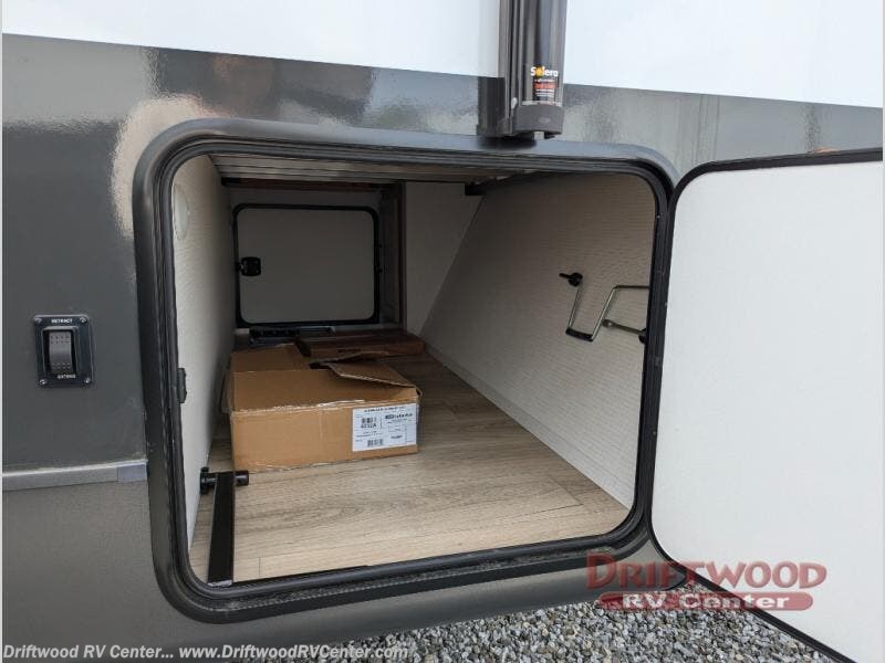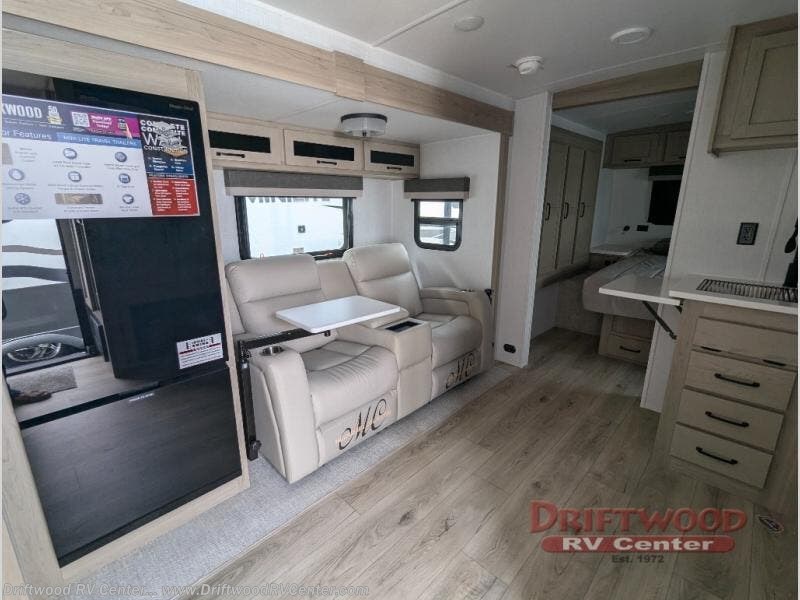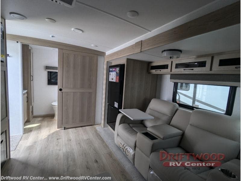 Camping trips to the lake just got sweeter with this dual slide out travel trailer in tow! Once you arrive, unload your gear from the exterior drop-frame pass-through storage, then start lunch on the exterior griddle. If you need a rest after traveling all day, the RV queen bed in the front bedroom is sure to give you comfort, or you can relax on the theater seating. The fireplace and entertainment center with a 32" TV will make this space feel just like home, and check out the spacious full rear bath for added privacy. This model also includes an entryway closet/pantry for jackets, shoes, and food!