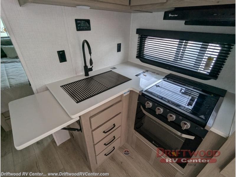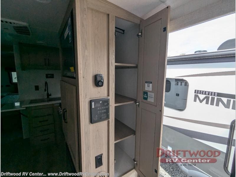 Each Rockwood Mini Lite travel trailer by Forest River is constructed with a fully laminated one-piece walkable roof, sleek frameless windows, and a six-sided full aluminum frame for strength and durability. The 12V thermostatically controlled heated tanks, plus radiant foil in the underbelly and slide out floors will allow you to camp well into the colder months, and the 200W roof solar panel will be perfect for a little off-gridding. Each model includes solid surface kitchen countertops, solid wood cabinet doors, night roller shades, plus many more interior features. Having an AIR 360+ omnidirectional antenna with WiFi prep on board gives you the option to get some work done if it's needed, and the power tongue jack provides hassle-free set up, so you can enjoy more time relaxing!