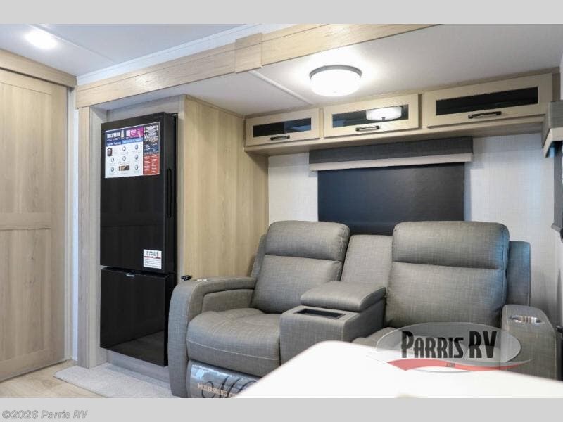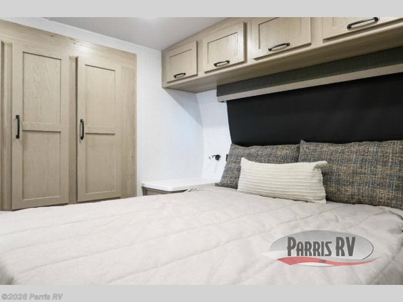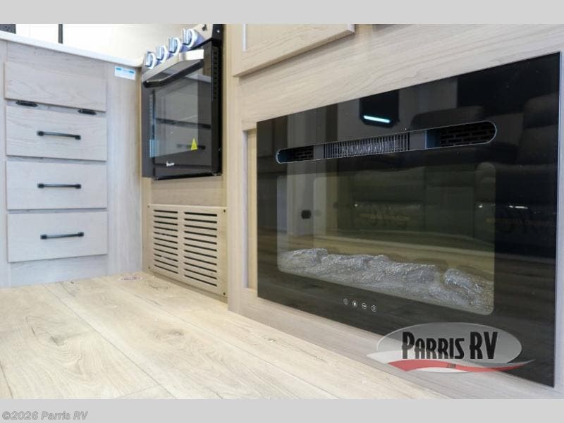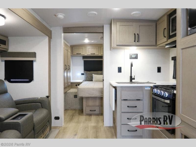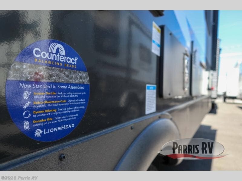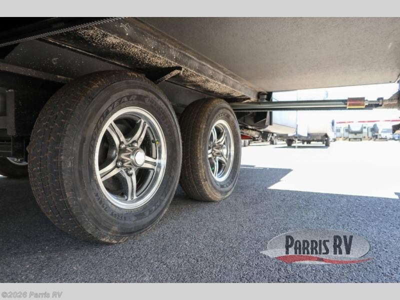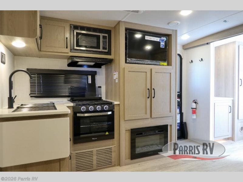 Camping trips to the lake just got sweeter with this dual slide out travel trailer in tow! Once you arrive, unload your gear from the exterior drop-frame pass-through storage, then start lunch on the exterior griddle. If you need a rest after traveling all day, the RV queen bed in the front bedroom is sure to give you comfort, or you can relax on the theater seating. The fireplace and entertainment center with a 32" TV will make this space feel just like home, and check out the spacious full rear bath for added privacy. This model also includes an entryway closet/pantry for jackets, shoes, and food!