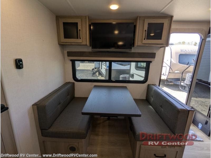 Each Rockwood Mini Lite travel trailer by Forest River is constructed with a fully laminated one-piece walkable roof, sleek frameless windows, and a six-sided full aluminum frame for strength and durability. The 12V thermostatically controlled heated tanks, plus radiant foil in the underbelly and slide out floors will allow you to camp well into the colder months, and the 200W roof solar panel will be perfect for a little off-gridding. Each model includes solid surface kitchen countertops, solid wood cabinet doors, night roller shades, plus many more interior features. Having an AIR 360+ omnidirectional antenna with WiFi prep on board gives you the option to get some work done if it's needed, and the power tongue jack provides hassle-free set up, so you can enjoy more time relaxing!