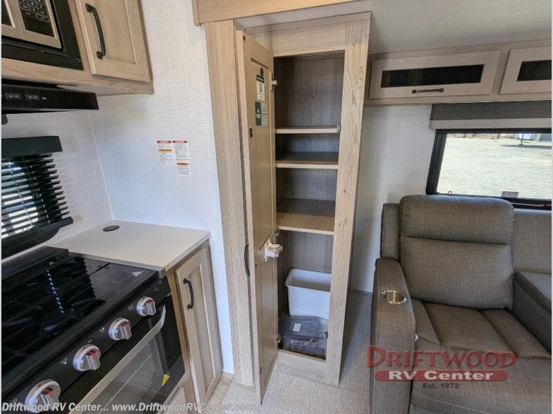 You and your spouse will have a great time camping in this travel trailer! You will have your own RV queen bed to sleep on in the front private bedroom, and an optional TV can be added if you enjoy the morning news in bed. Breakfast can be made on the three burner cooktop in the rear kitchen, or head outdoors to cook on the outside griddle. The 67" theater seating with cupholders will provide a place to relax and dine together, and the spacious walk-through bath will allow you to clean up before you head out for the day. This model includes plenty of storage space, including a pantry for your snacks, a wardrobe slide out in the bedroom, plus a drop-frame pass-through storage for larger camp gear!