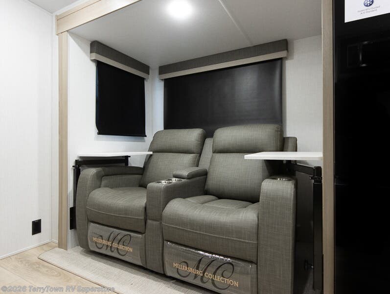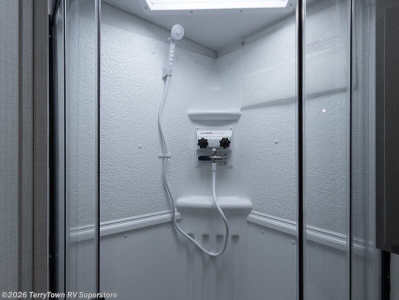 Escape the city life for weekend trips in this cozy couple's trailer. The dual entry doors will allow you to enter in through the rear private bedroom, or the front kitchen/main living area for convenience. You will enjoy relaxing on the theater seating across from the 32" TV and fireplace in the evenings, or you can visit outdoors under the 19' power awning. You'll also find an exterior griddle here for quick meals and exterior storage for the fishing poles or hiking gear. This model also includes a walk-through bath with a shower skylight, a linen closet, plus a Showermiser Water Saving System. And don't worry about storage space inside since this model includes an entryway pantry/closet, a second pantry in the front kitchen, plus a large bedroom wardrobe to keep your clothes wrinkle-free!