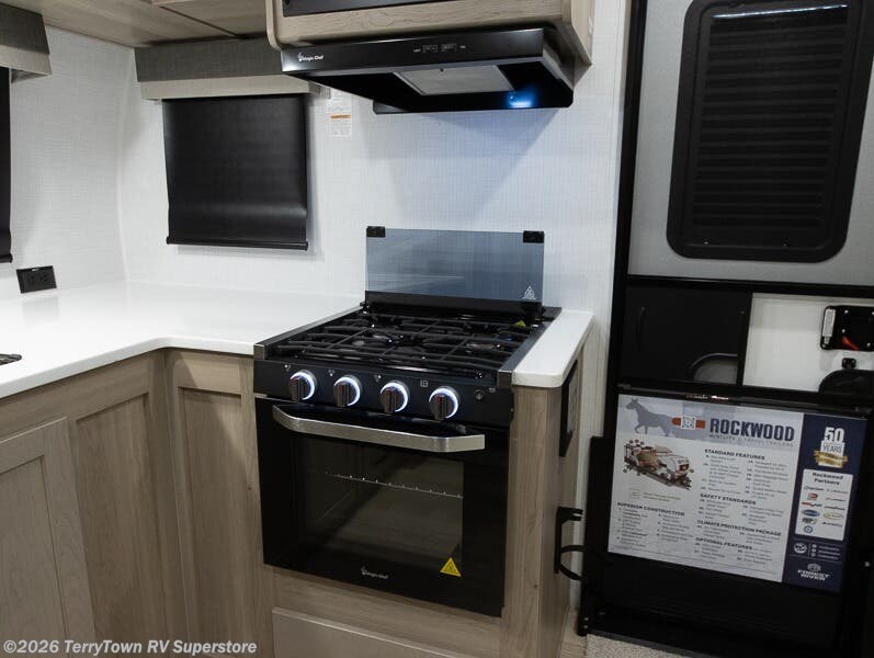 Each Rockwood Mini Lite travel trailer by Forest River is constructed with a fully laminated one-piece walkable roof, sleek frameless windows, and a six-sided full aluminum frame for strength and durability. The 12V thermostatically controlled heated tanks, plus radiant foil in the underbelly and slide out floors will allow you to camp well into the colder months, and the 200W roof solar panel will be perfect for a little off-gridding. Each model includes solid surface kitchen countertops, solid wood cabinet doors, night roller shades, plus many more interior features. Having an AIR 360+ omnidirectional antenna with WiFi prep on board gives you the option to get some work done if it's needed, and the power tongue jack provides hassle-free set up, so you can enjoy more time relaxing!