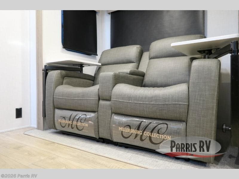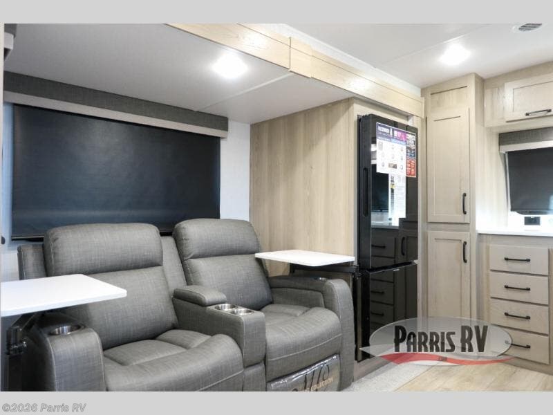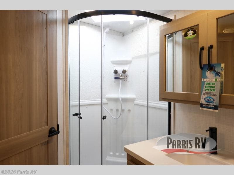 Escape the city life for weekend trips in this cozy couple's trailer. The dual entry doors will allow you to enter in through the rear private bedroom, or the front kitchen/main living area for convenience. You will enjoy relaxing on the theater seating across from the 32" TV and fireplace in the evenings, or you can visit outdoors under the 19' power awning. You'll also find an exterior griddle here for quick meals and exterior storage for the fishing poles or hiking gear. This model also includes a walk-through bath with a shower skylight, a linen closet, plus a Showermiser Water Saving System. And don't worry about storage space inside since this model includes an entryway pantry/closet, a second pantry in the front kitchen, plus a large bedroom wardrobe to keep your clothes wrinkle-free!