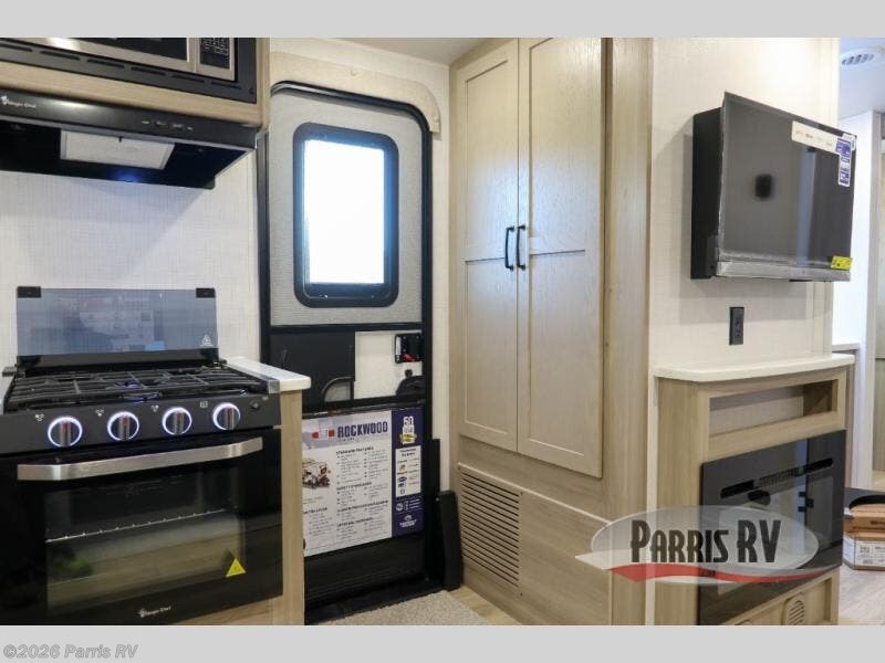 Each Rockwood Mini Lite travel trailer by Forest River is constructed with a fully laminated one-piece walkable roof, sleek frameless windows, and a six-sided full aluminum frame for strength and durability. The 12V thermostatically controlled heated tanks, plus radiant foil in the underbelly and slide out floors will allow you to camp well into the colder months, and the 200W roof solar panel will be perfect for a little off-gridding. Each model includes solid surface kitchen countertops, solid wood cabinet doors, night roller shades, plus many more interior features. Having an AIR 360+ omnidirectional antenna with WiFi prep on board gives you the option to get some work done if it's needed, and the power tongue jack provides hassle-free set up, so you can enjoy more time relaxing!