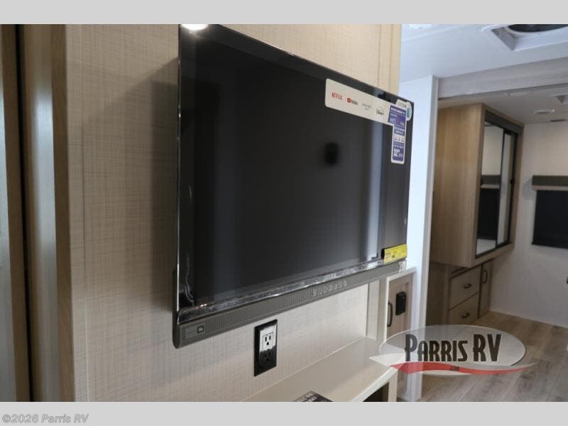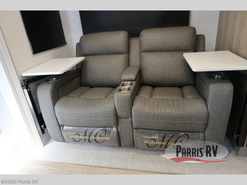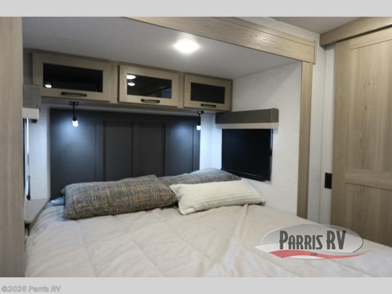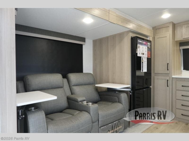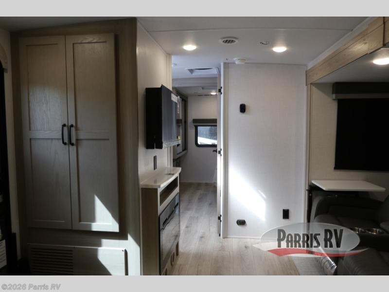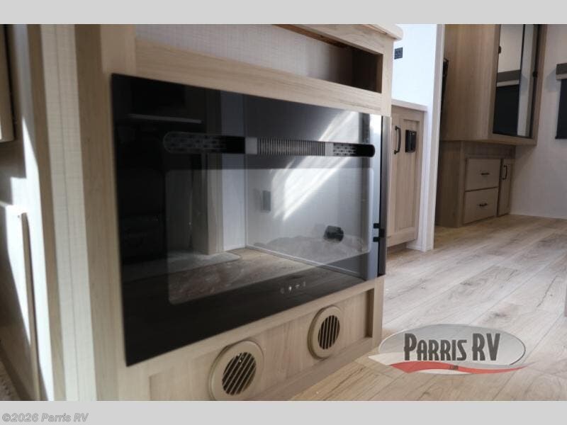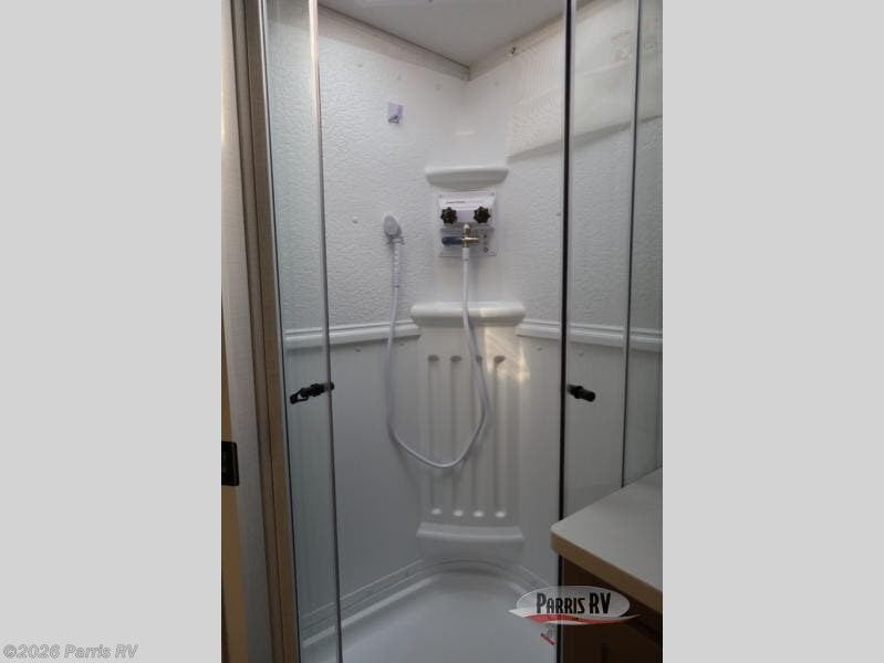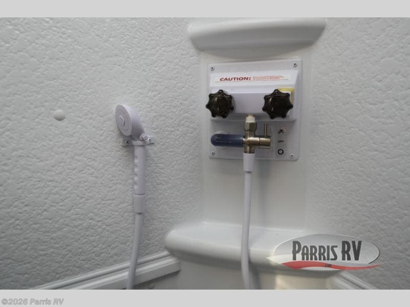 Escape the city life for weekend trips in this cozy couple's trailer. The dual entry doors will allow you to enter in through the rear private bedroom, or the front kitchen/main living area for convenience. You will enjoy relaxing on the theater seating across from the 32" TV and fireplace in the evenings, or you can visit outdoors under the 19' power awning. You'll also find an exterior griddle here for quick meals and exterior storage for the fishing poles or hiking gear. This model also includes a walk-through bath with a shower skylight, a linen closet, plus a Showermiser Water Saving System. And don't worry about storage space inside since this model includes an entryway pantry/closet, a second pantry in the front kitchen, plus a large bedroom wardrobe to keep your clothes wrinkle-free!
