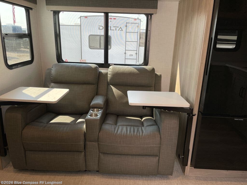 Escape the city life for weekend trips in this cozy couple's trailer. The dual entry doors will allow you to enter in through the rear private bedroom, or the front kitchen/main living area for convenience. You will enjoy relaxing on the theater seating across from the 32" TV and fireplace in the evenings, or you can visit outdoors under the 19' power awning. You'll also find an exterior griddle here for quick meals and exterior storage for the fishing poles or hiking gear. This model also includes a walk-through bath with a shower skylight, a linen closet, plus a Showermiser Water Saving System. And don't worry about storage space inside since this model includes an entryway pantry/closet, a second pantry in the front kitchen, plus a large bedroom wardrobe to keep your clothes wrinkle-free!