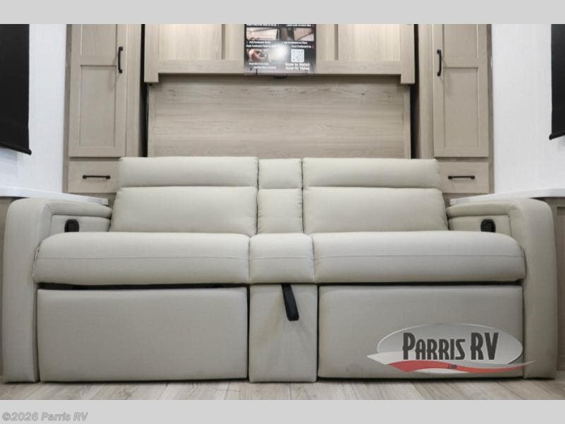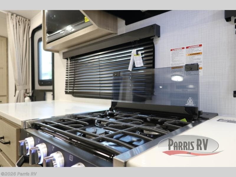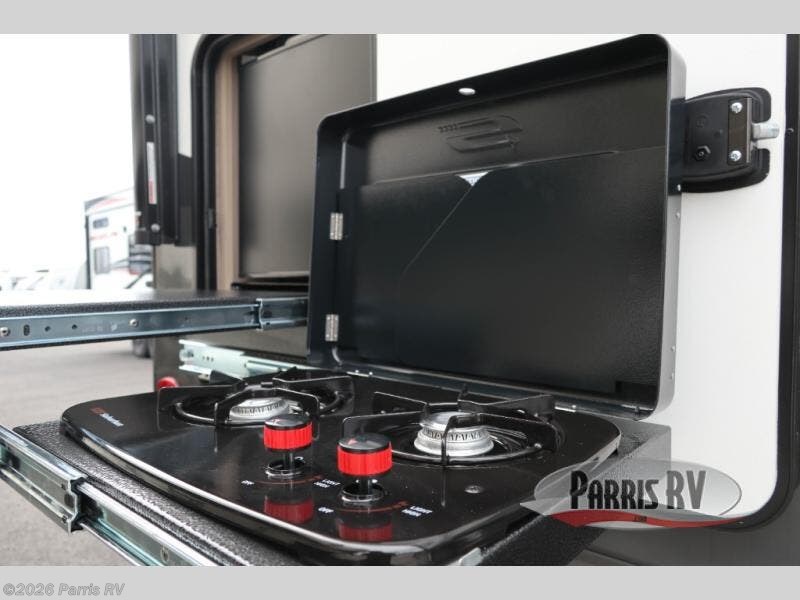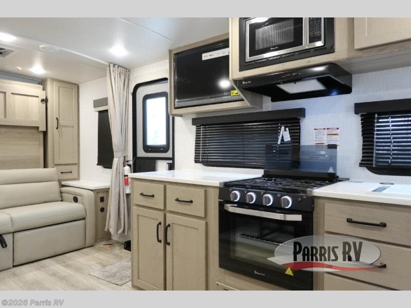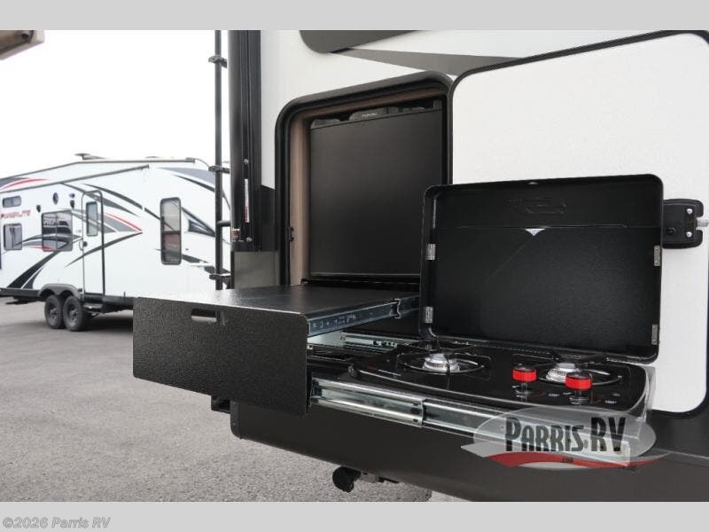 This is the perfect travel trailer for two or four people looking for comfortable and versatile camping trips! You will have your own Murphy bed to sleep on in the front at night, and during the daytime you can fold it up and have a 74" sofa in its place. No need to even make the bed! Breakfast can be made on the three burner cooktop inside, or head outdoors to cook on the outside griddle and pull-out stove under the 18' awning. The U-dinette offers ample room for everyone to gather for a meal or games, and can be transformed into sleeping space as well. This space could also feature an optional theater seat with a table or a hide-a-bed with table if you would prefer to replace the dinette. The kitchen features a refrigerator within the large slide as well as a microwave above the stove, plenty of counter space and overhead cabinets. On the exterior, you will find two storage compartments and a rear ladder for your convenience, plus more.