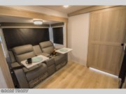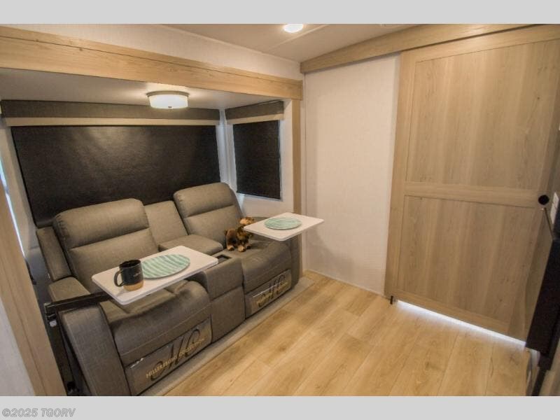 Pick your favorite campground to take this travel trailer to! Once you arrive, unload your gear from the exterior drop-frame pass-through storage, then start lunch on either the exterior griddle or the three burner cooktop inside. If you need a rest after traveling all day, the RV queen bed with flip-up storage in the front bedroom is sure to give you comfort, or you can relax on the 67" theater seating. The entertainment center will make this space feel just like home, and check out the spacious full rear bath for added privacy. This model also includes a 20' power awning to relax underneath rain or shine!