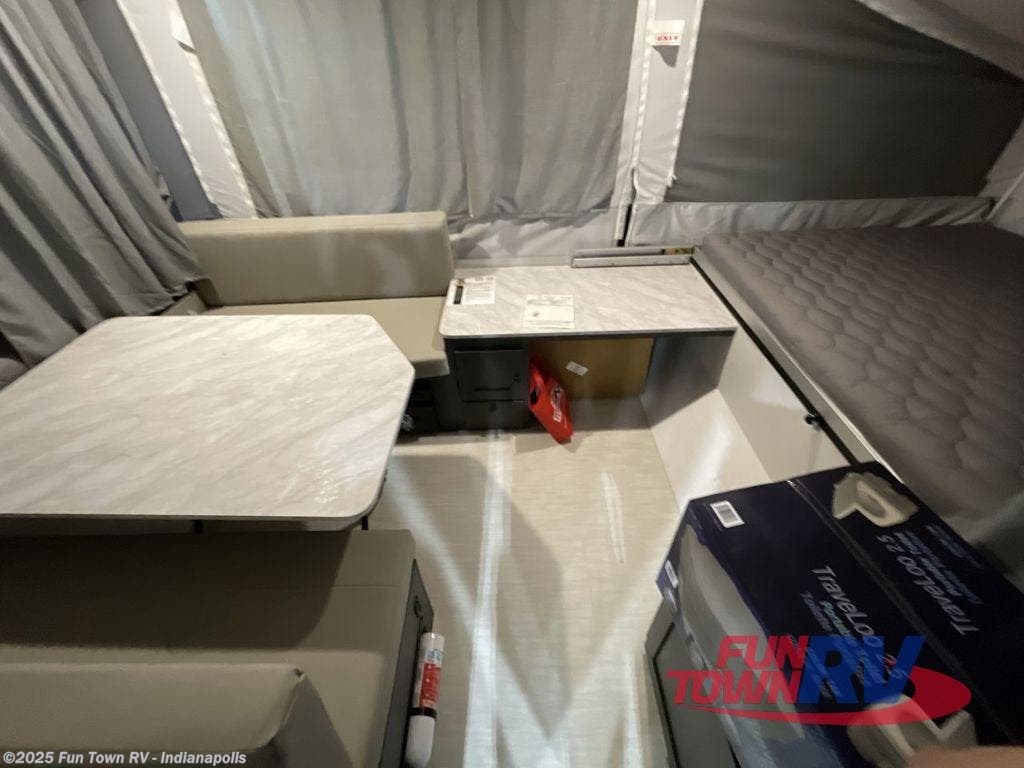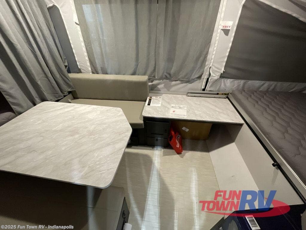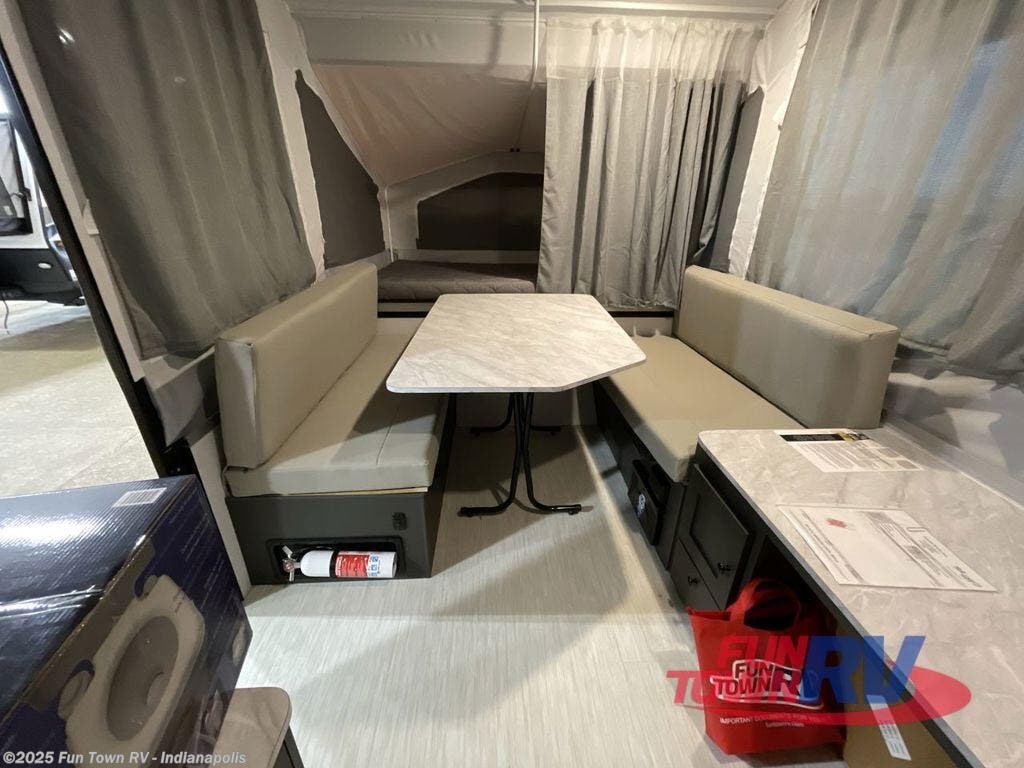 With any Rockwood OTG (Off The Ground) folding pop-up camper by Forest River, you will enjoy a more simple approach to outdoor fun. If you're a regular tent camper, but are looking for a little more comfort, then take a look at these easy-to-tow models! There are electric brakes, balancing bead filled tires, and leaf spring axles that provide that easy towing, and the alloy fiberglass exterior is durable. A one-piece screen door also comes standard so you can let fresh air in, while keeping bugs out, and the LED interior lights will be an added benefit you didn't have while tent camping. Each model also includes residential style cabinet doors, wood look flooring, and an Andover Sable wood interior for a more outdoorsy feel!